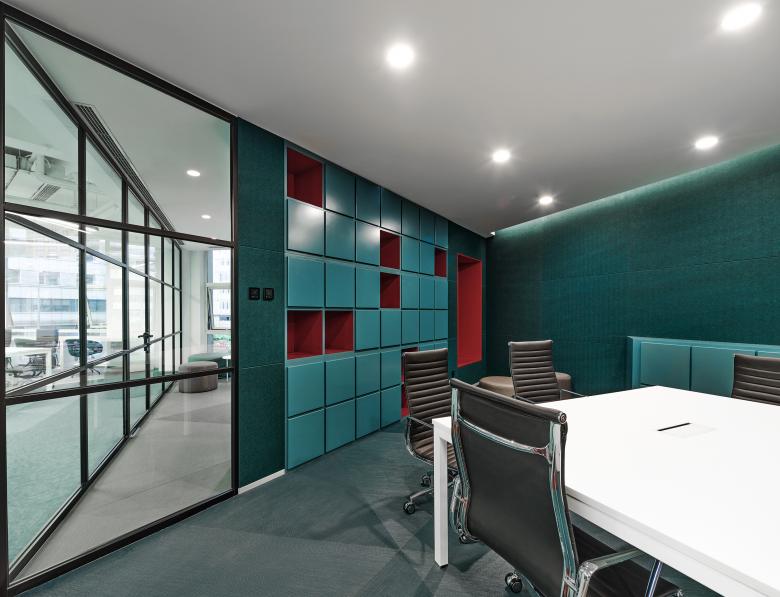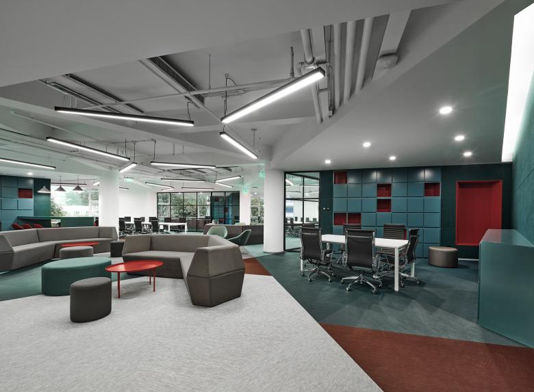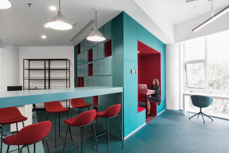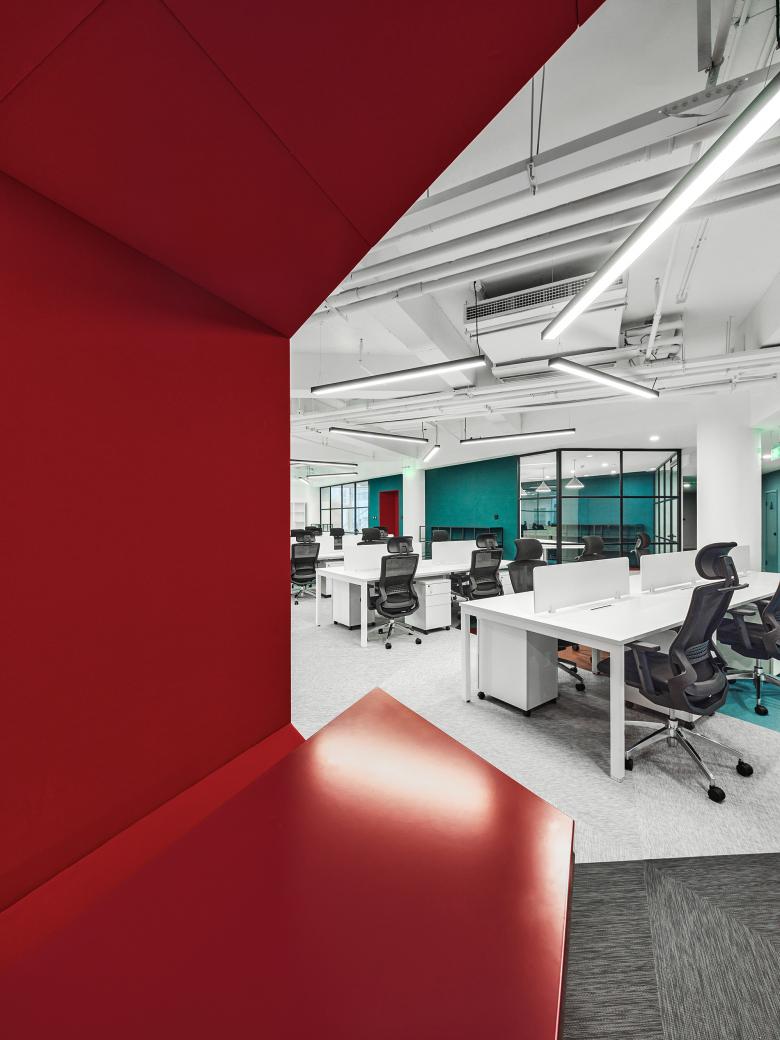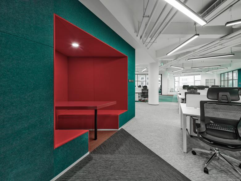 The triangular zoning further influenced the floor pattern and guided the color scheme of the space, including the red, which is part of the Sanlian’s Visual Identity. We opted for a bold combination of darker and lighter shades of turquoise and the punctuated burgundy red to create a vibrant combination that energizes the space. The ceiling embraces the triangulation as well. Following the direction of the beams, the triangular surface is stressed by linear lighting fixtures. The key lounge pieces of furniture outline the triangular intersections on the floor and even the signage system incorporates the triangle and rounds up the overall design.