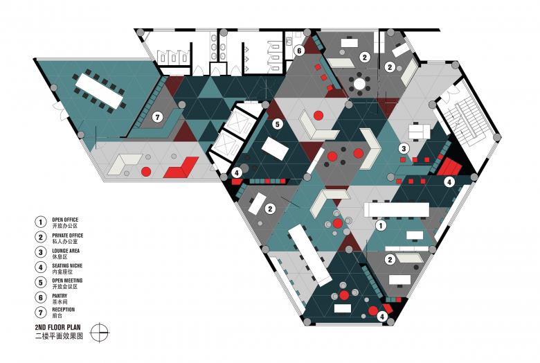 “The geometric play makes the space highly functional, and lead to a holistic design that implemented triangulation not only in circulation, area division and program allocation, but also in the partitioning, lighting fixtures, and signage system. Sanlian’s new office offers the cilent a fresh, dynamic kick, an iconic new appearance that aligns with their work intentions,” concluded by Binke Lenhardt, co-founder and partner of Crossboundaries.