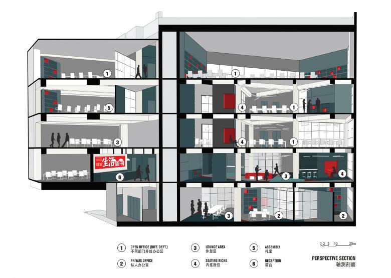Crossboundaries’ design solution for the interior of the Sanlian magazine offices in Beijing combines the geometric logic inherited from the existing structure with the new workflow goals of the occupant.
