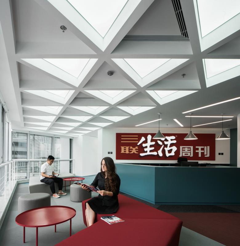 Inspired by the structural layout of the entire building that is based on a triangular grid, we continued this strong geometric DNA thread into the interior fit out. Besides the triangle, we found another clue that was all about the number 3. The occupant of the office is a publishing house called Sanlian (in Chinese 三联) with the number “3” in its name, focusing on three main domains – society, knowledge and lifestyle.