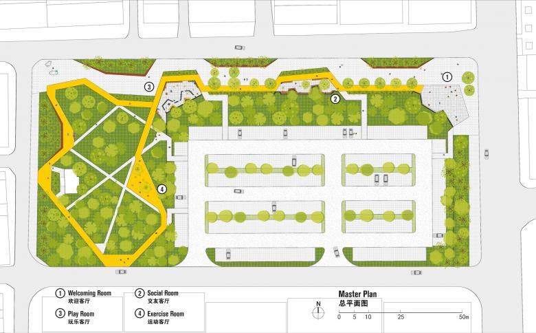 The L-shaped plot features a series of outdoor ‘rooms’ that provide unrestricted usage and trigger a variety of activities along a linear loop track, serving as a connecting element that meanders between the street side pavement and the park at a pocket of the site. The yellow track connects the rooms physically with each other, while also forming a visual link between the different public areas. The path extends into and through the small park area, which depicts a more natural landscape, with London plane and Ginkgo trees, in contrast to the organized promenade in the front. Linked by the yellow track, these rooms offer different levels of enclosure and boundary along a sequence: from completely open, forming a prelude-like plaza, to a slightly more defined area with a semitransparent grey backing wall, and an enclosed space that opens to the sky. The final space is less strictly defined within the new park zone, with only the ground surface marking its expanse.