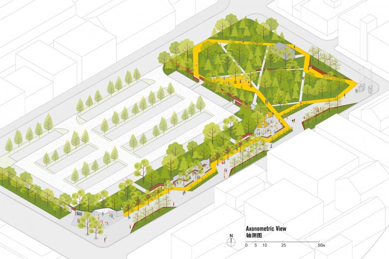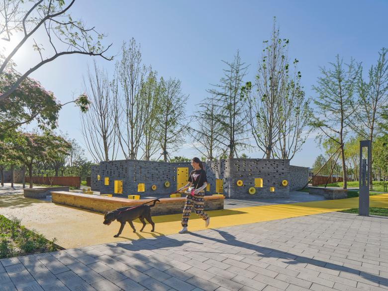 Transforming the initial street corner into a small plaza, the first room opens up a semicircular space defined by angular brick walls and large mirror surfaces. In the morning, it serves as a gathering place for tai chi and fan dance, while in the evening it attracts groups of rhythmic dancers. Dog owners can also be seen strolling with their beloved pets along the bright yellow asphalt loop that connects the rooms.