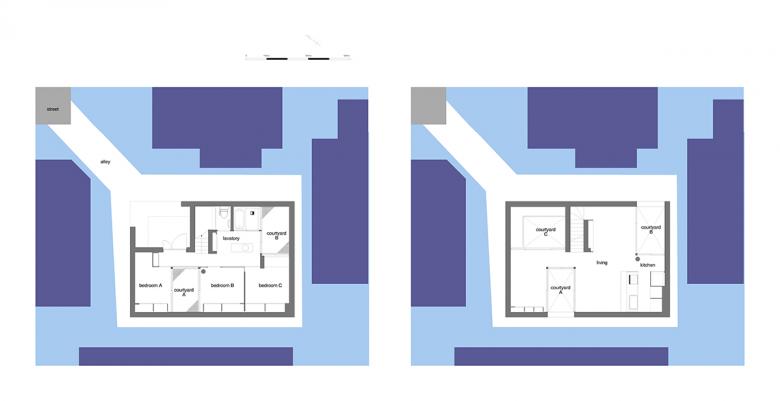 In this house, the maximum volume of two stories with base area of 63 square meters raises. The gap of 19 square meters between the base area and the maximum building area becomes three courtyards. All windows are disposed facing to the courtyards, and the courtyards would be felt as a continuous space.
