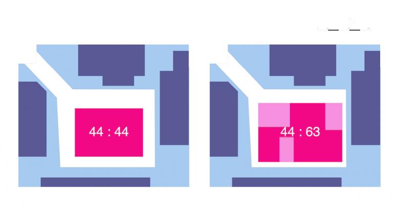 44 means the maximum building area by the law. While, 63 means the base area of the max volume of two stories that is defined by the oblique line control based on the construction regulation and the minimum clearance distance between the building and the property line based on the civil law and the construction way.