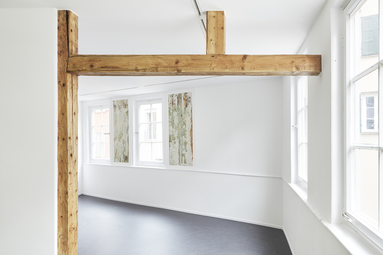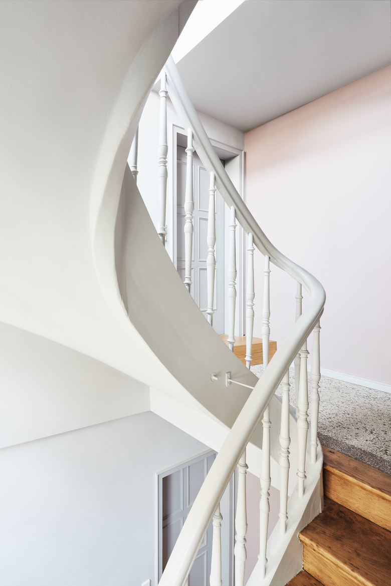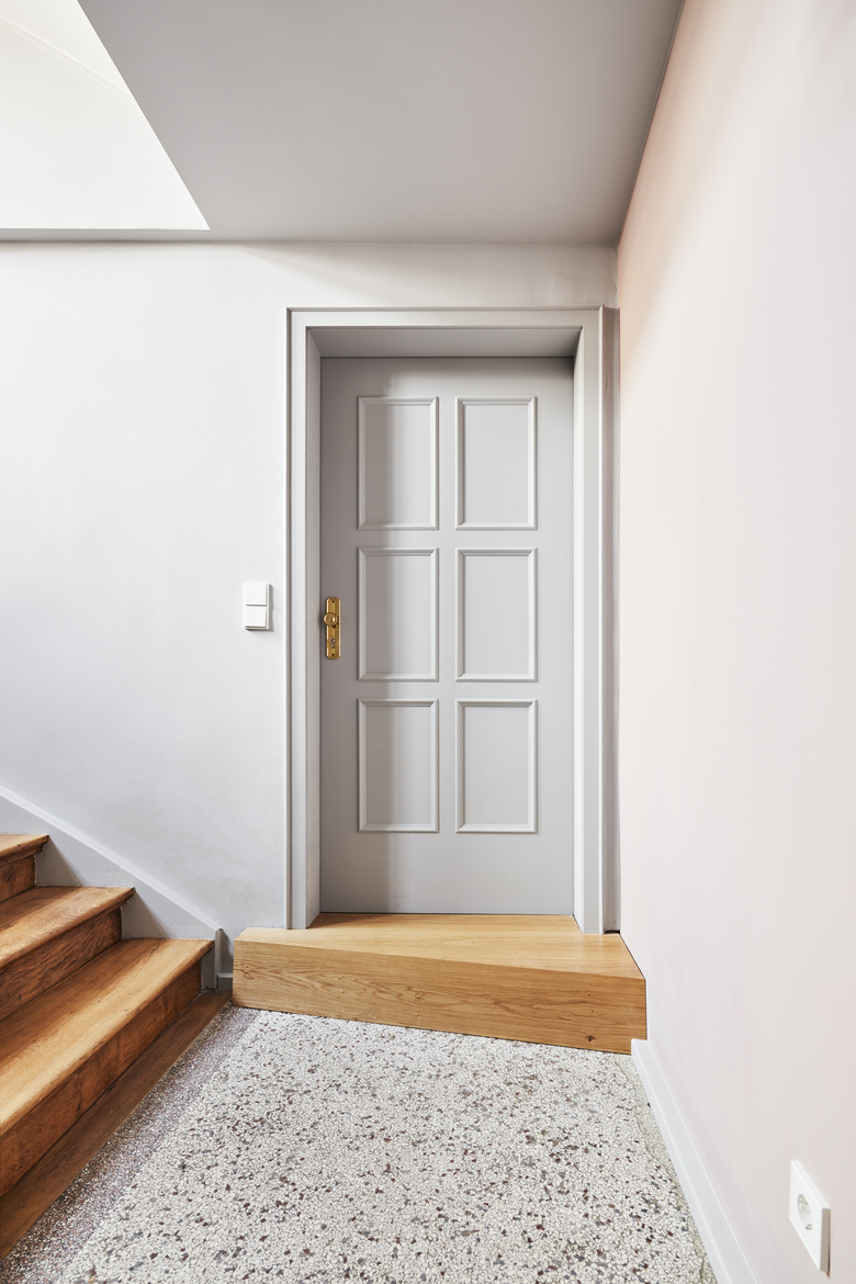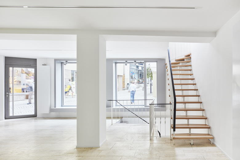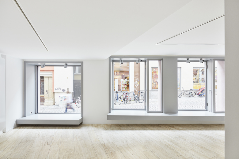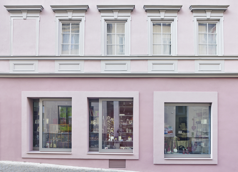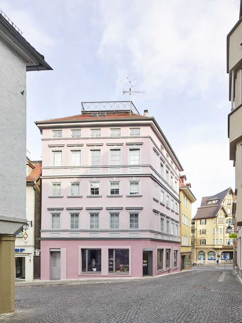 Das Wohn- und Geschäftshaus wird denkmalgerecht saniert und neu interpretiert. Die Demontage der Fensterläden macht die ursprüngliche Fassadenproportion sichtbar. Eine zweiteilige Detaillierung der Simsbänder ermöglicht eine langfristige Schadensfreiheit und erhält die Eleganz der klassizistischen Fassade. Die Einheitlichkeit in der zartgrauen Farbgestaltung von Fenstern, vorbewittertem Stahlblech, Regenrinne und Fallrohr entspricht der ursprünglichen Farbigkeit des Gebäudes. Als Kontrast wirkt eine rosa Putzoberfläche. Das Sockelgeschoß wird neu interpretiert. Es ist als massive Basis mit Lochschaufenstern gestaltet und durch zurückspringende Fensterebenen modelliert. Die Materialien des Treppenhauses werden freigelegt und restauriert. Sie erzählen die Historie des Hauses.