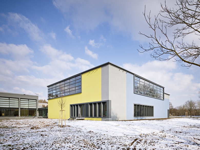 Die Gestalt der Gebäudehülle spielt mit der Geometrie der Gesamtanlage. Der Baukörper der Turnhalle ist mit unterschiedlich farbig abgesetzten Putzflächen versehen, die spielerisch um die Baukörperecken herumgeführt werden. Die Farbigkeit ist frei angelehnt an die Olympiafarben von 1972 - als Reminiszenz an die Entstehungszeit des Gesamtkomplexes. Das Gesamtkonzept sieht vor, diese Farbigkeit in den weiteren, energetischen Sanierungsabschnitten sukzessive um alle Bausteine des Instituts herum zu führen.