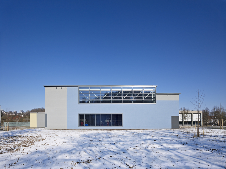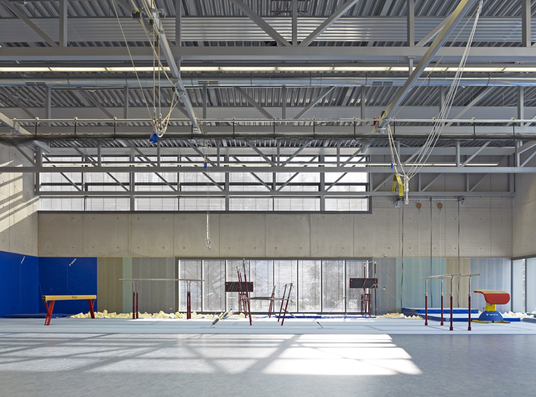 Die ausschließliche Nutzung als Halle für Kunstturnen ermöglicht die freie Anordnung von Glasfassadenflächen, die sowohl in erdgeschossiger Turnebene als auch als Oberlichter angeordnet sind. Der Raum erhält somit eine optimale natürliche Belichtung und die Aussicht auf den Goldersbach und den Österberg.