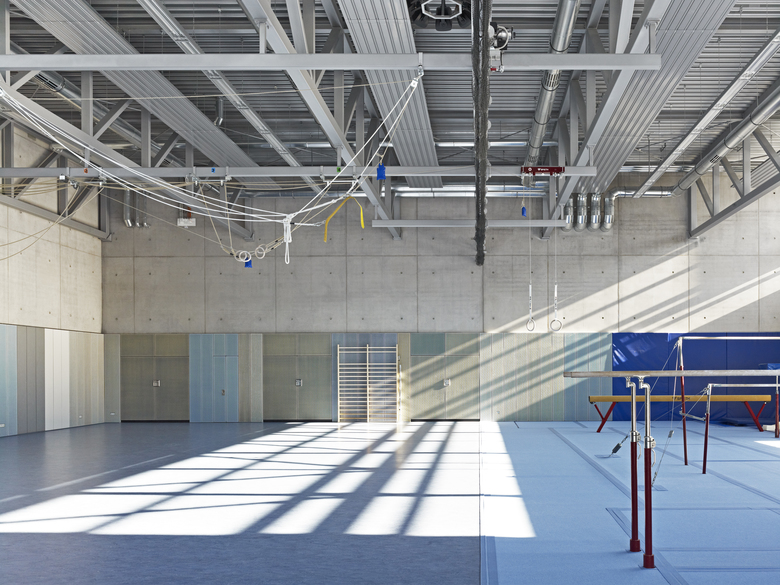 Der Baukörper der Kunstturnhalle wird, analog zu den übrigen Bausteinen des Gesamtkomplexes, als Massivbau mit Stahldachtragwerk ausgeführt. Der Innenraum erhält Sichtbetonoberflächen und im Sockelbereich Prallwandverkleidungen aus farbig lasierten Holzwerkstoffplatten, Whiteboards, Pinnwänden, Geräte-Schwingtoranlagen, Schaumwandbekleidungen, Sprossenwänden und Seilnischen.