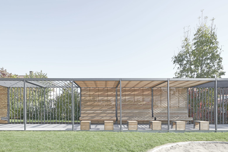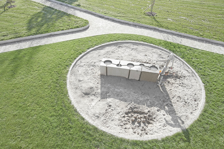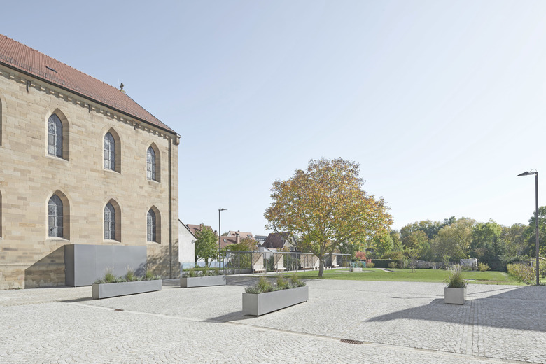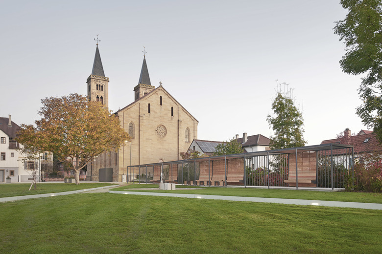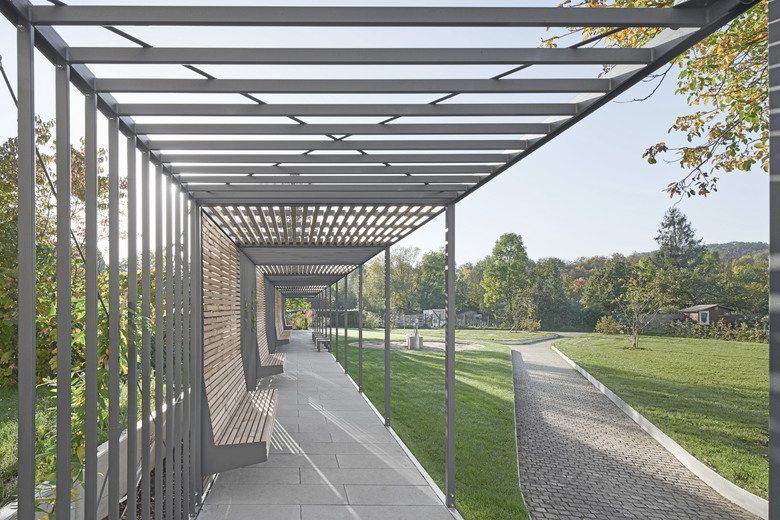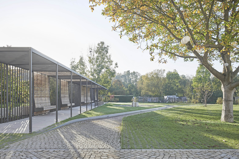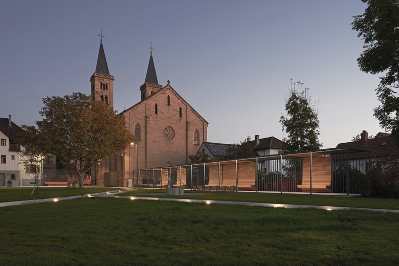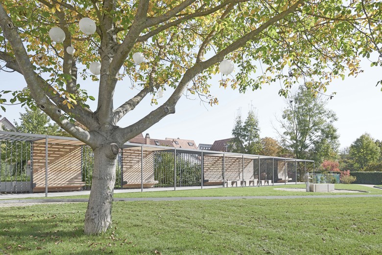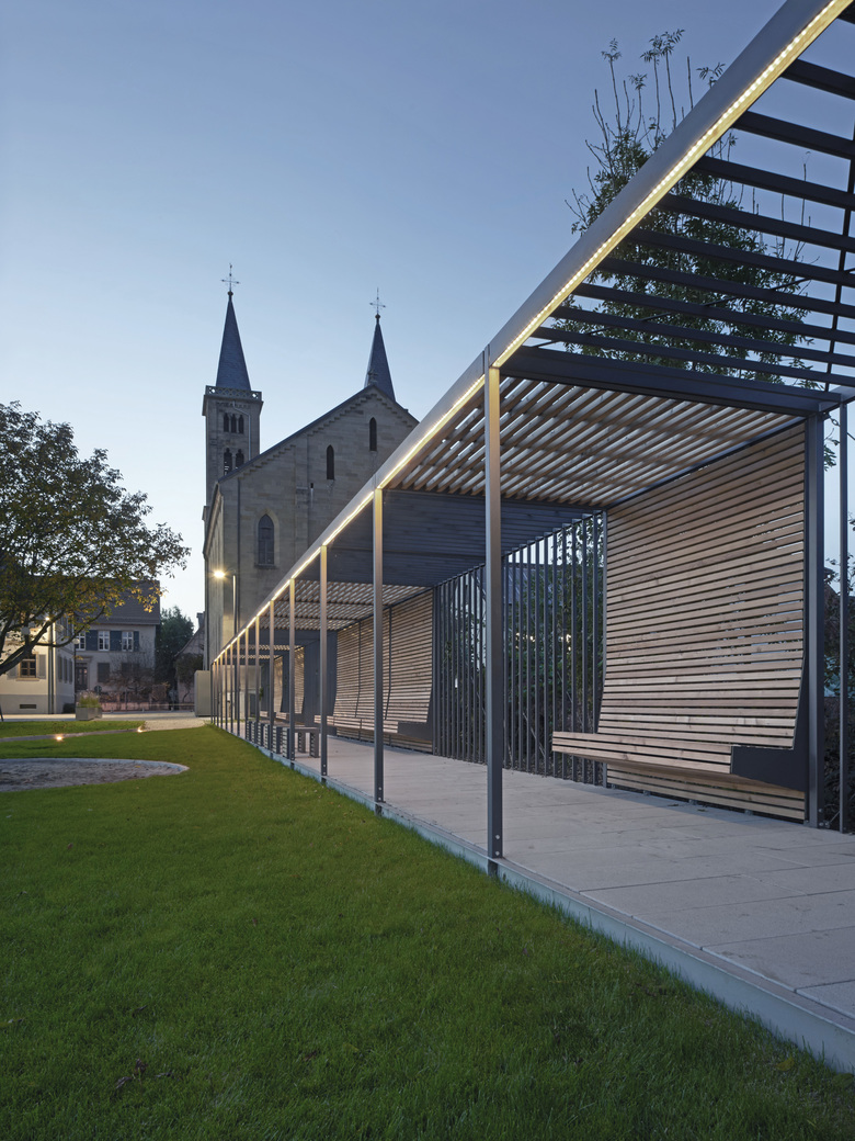 Der erste Schritt der Sanierung des Rathausumfeldes in Zaisenhausen war die Umwandlung des bisherigen Farrenstallareals in einen neuen Dorfplatz. Die bisher ungenutzte Wiese und der unbefestigte Parkplatz direkt neben der dominanten Kirche sollten funktional optimiert und der Öffentlichkeit besser zugänglich gemacht werden. Der nördliche Abschnitt mit direkter Verbindung zur Hauptstraße wurde großflächig mit Natursteinpflaster belegt und damit zu einem multifunktional nutzbaren und attraktiven Platz umgewandelt. Der bestehende Walnussbaum bildet den Übergang von befestigter Fläche zur Grünanlage, die östlich von einer Hecke und westlich von einer langen Pergola räumlich gefasst wird. Die neu angelegte Wiese kann nun über einen leicht geschwungenen Weg, vorbei an einem Sandkasten mit Wasserspiel, in Richtung Süden durchquert werden. Die Pergola bildet das räumliche und gestalterische Rückgrat der Freianlagen und lädt mit etlichen Sitzgelegenheiten zum Verweilen ein.
