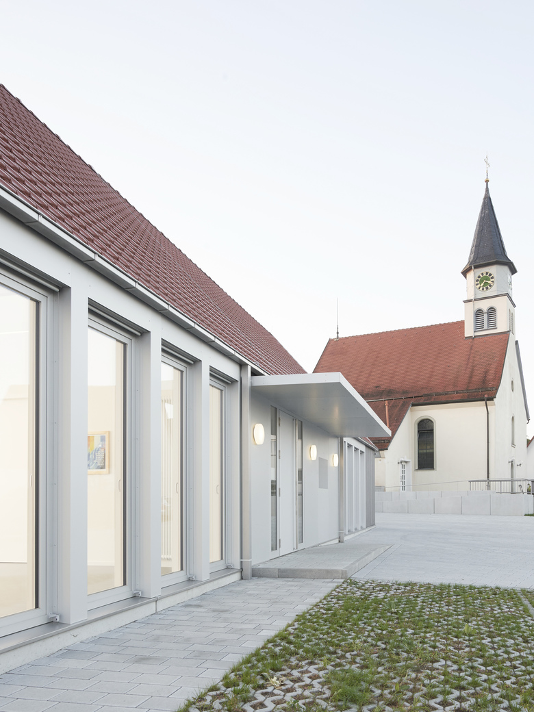 Der langgestreckte Baukörper des neuen Evangelischen Gemeindehauses in Göppingen Holzheim befindet sich hinter der spätmittelalterlichen St. Bernhardkirche. Die Baumasse ist direkt an der östlichen Grundstücksgrenze in Verlängerung der Sakristei platziert um sowohl für Veranstaltungen wie auch für die notwendigen Parkplätze ausreichend Raum anzubieten. Außerdem lenkt diese Gebäudekonstellation auch den Blick auf den nahe liegenden geschichtsträchtigen Berg Hohenstaufen. Die Gebäudetypologie mit eingeschossiger Nutzung und steilem Satteldach lehnt sich an ortstypische landwirtschaftliche Nutzbauten an. Das Gebäude ist, abgesehen von der Bodenplatte, eine reine Holzkonstruktion, die konsequenterweise auch mit einer grau lasierten Holzlattung verkleidet ist. Die Fenster der Aufenthaltsräume sowie der Eingang werden durch silberfarben eloxiertes Aluminium hervorgehoben. Das großzügige Volumen des Gemeindesaals spiegelt die Gebäudeform wider und ist geprägt durch die Zugstäbe der Dachkonstruktion. Darin ist gleichzeitig auch die Beleuchtung in Form von unauffälligen LED- Lichtbändern integriert.