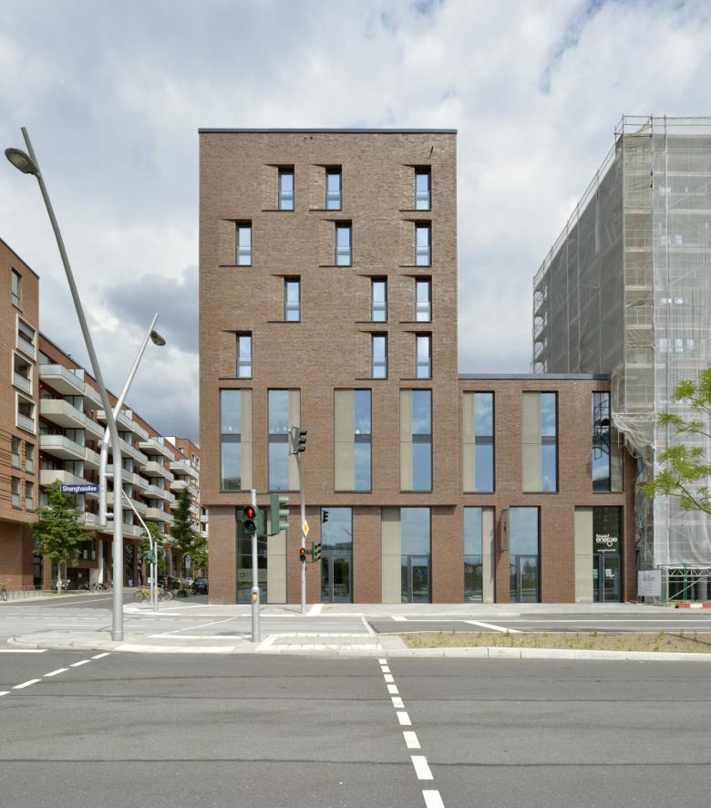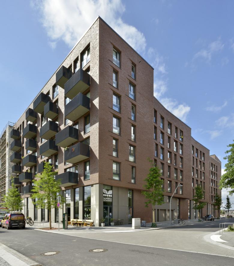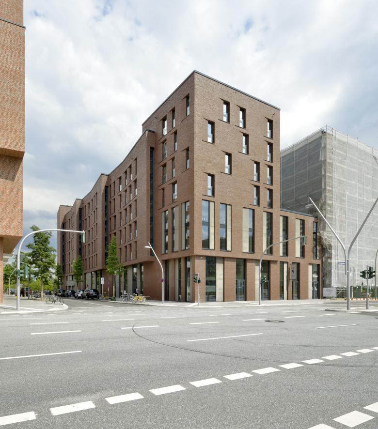 Das Ergebnis eines geladenen hochbaulichen Wettbewerbes bildet die Grundlage für die Blockrandbebauung im östlichen Teil der HafenCity Hamburg. Am Lohsepark entstehen Neubauten für ein Wohn- und Arbeitsquartier mit 65 Wohneinheiten für eine Baugruppe, gewerblicher Nutzung sowie eine Kindertagesstätte im Erdgeschoss. In Anlehnung an die Bebauung der Speicherstadt entsteht für den nördlichen Teil der geplanten Blockrandbebauung eine stringente, sehr ausdrucksstarke Fassadengestaltung. Die zeitgemäße Backstein-Lochfassade sorgt für ein ruhiges Erscheinungsbild und passt sich in Farbigkeit und Struktur den umgebenden, neu entstehenden Gebäuden an, ohne auf einen eigenständigen, individuellen Charakter und eine zeitgemäße Formensprache zu verzichten. Dem Wunsch nach ablesbaren, identitätsstiftenden Gebäudeteilen folgend wird ein einfaches aber wirkungsvolles Gestaltungsprinzip angewendet: Jeweils zwischen den Erschließungseinheiten wird die Fassade oberhalb der Sockelzone bis zu einen Meter nach außen geneigt. So zeigt die Schrägansicht ein differenziertes, vertikales Fassadenspiel, bei dem sich die Klinkerverkleidung wie eine überdimensionale Schuppung um das Gebäude “wickelt”. Durch die Auffächerung der Fassade entsteht neben der visuellen Orientierung der hier liegenden Räume zum Lohsepark ein weiterer positiver Effekt in Bezug auf den Lärmschutz. Die Belichtungsöffnungen im Norden und Westen erhalten zusätzlich an jeweils einer Seite keilförmige Einschnitte, die das Thema der Fassadenschuppung im Detail übersetzt und zu einer feinen Plastizität der Fassade führt. Neben den gemeinschaftlich genutzten, begrünten Dachebenen entstehen Pavillons, die einzeln oder verbunden mit der darunter liegenden Ebene als Maisonettewohnungen bewohnt werden.
