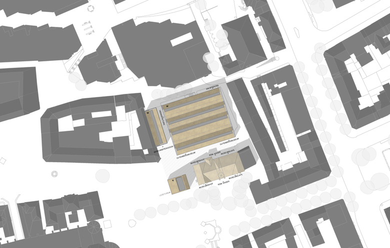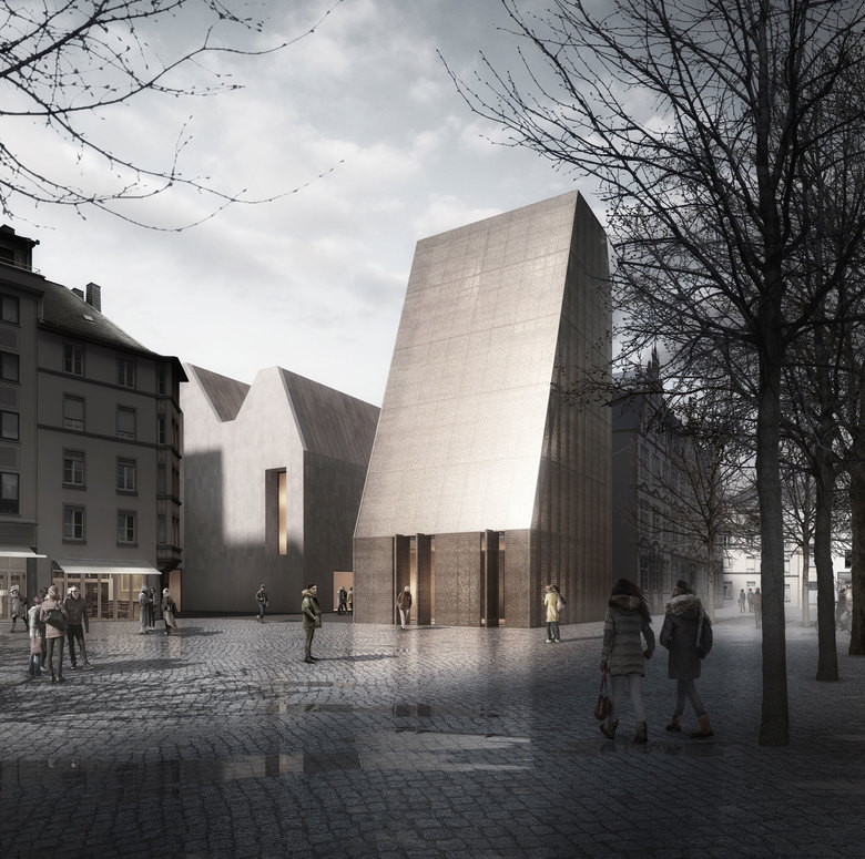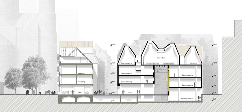 Das im Zentrum der Mainzer Altstadt gelegene Gutenberg Museum gilt seit 1962 als Weltmuseum der Druckkunst. Im Vordergrund der Wettbewerbsaufgabe steht die Neuanordnung der Ausstellungs- und Funktionsflächen sowie die Erweiterung des Museums. Dabei soll das zukünftige Erscheinungsbild des Museums mit seiner exponierten Lage in direkter Nachbarschaft zum Mainzer Dom den hohen städtebaulichen Ansprüchen als neuer Anziehungspunkt der Altstadt gerecht werden. Auf einer annähernd quadratischen Planfläche stehen derzeit die drei Bestandsgebäude des Museumskomplexes. Durch die Addition eines weiteren Gebäudes, einer Überformung der Dachlandschaft des Schellbaus und dem Abriss des Verbindungsbaus entsteht ein offenes Gefüge von Solitären: Ein einladendes Forum für die Kultur und der Wissenschaft im Herzen der Stadt. In einem ersten Bauabschnitt werden die drei Bestandsgebäude um einen Neubau, den Bibliotheksturm, ergänzt. Der sich nach oben hin verjüngende Baukörper beherbergt die Bibliothek mit Bücher- und Leselounges. Die Fassade, bestehend aus einem mit frei gesetzten Buchstaben perforierten Kupferblech als Bronzelegierung erinnert an die Arbeit Gutenbergs, gleichzeitig erhält das Gebäude durch die Transparenz der Fassade eine differenzierte Tiefenwirkung, die je nach Tageszeit eine unterschiedliche Atmosphäre erzeugt. Durch die Lage direkt am Liebfrauenplatz, der skulpturalen Erscheinung sowie seiner Materialität erhält der Baukörper eine besondere Fernwirkung für Passanten und wird zum Anziehungspunkt des neuen Quartiers. Die neue Dachlandschaft des sogenannten Schellbaus beherbergt einen vergrößerten Vortragsraum, in einer baulichen Erweiterung im Süden am Quartiersplatz befindet sich der zukünftige Hauptzugang zum Museumsquartier.