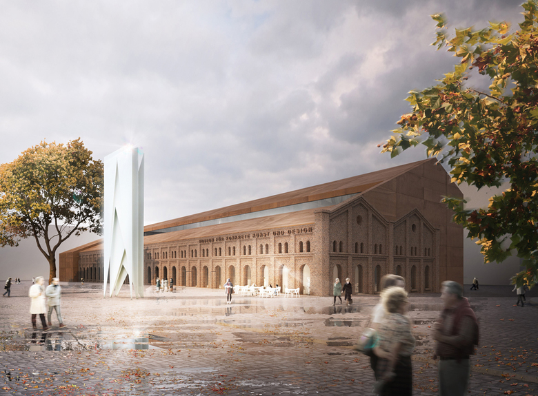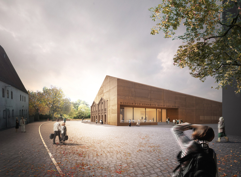 Eine denkmalgeschützte ehemalige Gießereihalle aus dem 19. Jahrhundert soll zu einem Museum für konkrete Kunst und Design umgenutzt und erweitert werden. Maßgebend für den Entwurf ist der Ansatz, ein Gebäude von ganz eigenem Charakter zu schaffen, das die Geschichte des Ortes und den Inhalt der Sammlung auf einzigartige, zeitgemäße Weise miteinander verbindet und erfahrbar macht. Besondere Aufmerksamkeit gilt der historischen Bausubstanz der alten Gießereihalle. Sie wird ergänzt durch ein Volumen, das sich im Westen an den Hauptbau anfügt und diesen im Süden überbaut und erweitert. So entsteht innerhalb eines neu geordneten städtebaulichen Umfeldes ein markantes und zeichenhaftes Gebäude, das formale Bezüge zur historisch bedeutsamen Nachbarschaft, dem Neuen Schloss aus dem 15. Jahrhundert und der zum Schlosskomplex gehörenden Rossmühle aus dem 16. Jahrhundert, aufnimmt. Die rostrote Cortenstahl-Bekleidung der neuen Fassaden- und Dachflächen erinnert an die ehemalige Nutzung und bildet mit der Ziegelfassade der Gießereihalle eine harmonische Einheit. Die modernen Gestaltungselemente der Erweiterung stärken den Altbau und machen das Gebäude als Gesamtensemble erlebbar. Dabei bleibt die historische Basis außen wie innen jederzeit ablesbar.