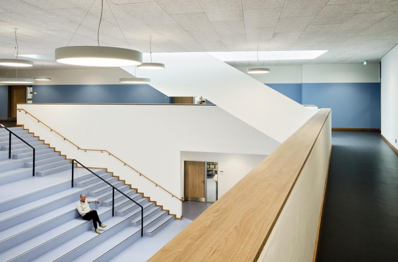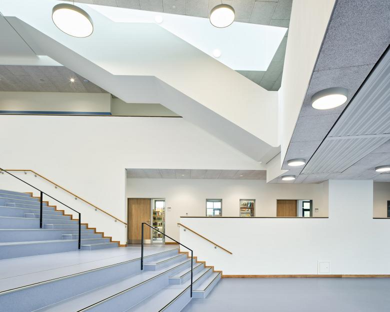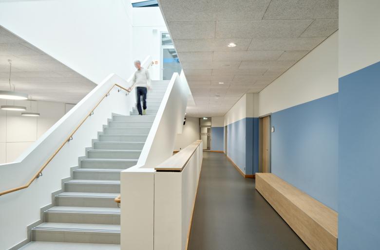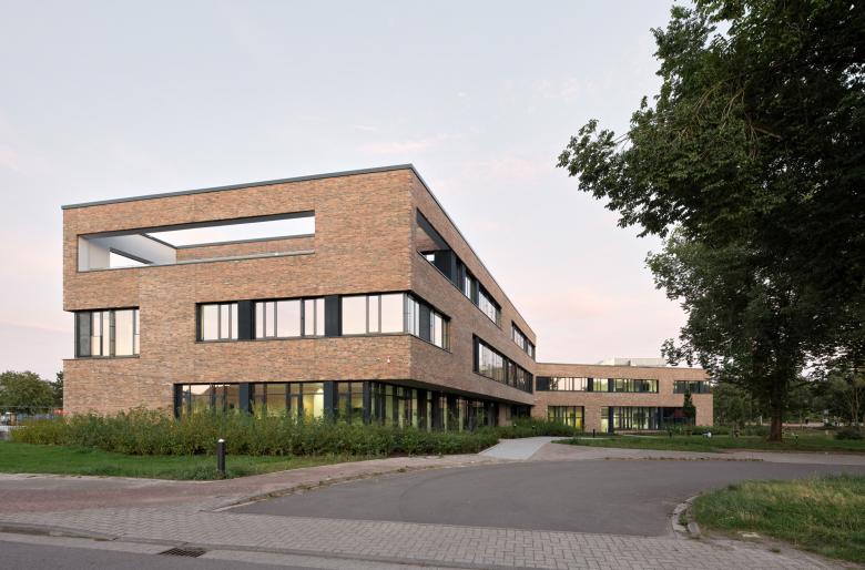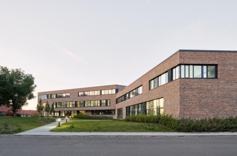 Der Entwurf der 3-zügigen Oberschule entstand im Zuge eines nichtoffenen Planungswettbewerb bei dem DFZ den ersten Preis erhielt. Vier bisher voneinander getrennte Blöcke werden in dem windmühlförmigen Baukörper integriert und beinhalten Unterrichtsräume, Fachräume, Verwaltung, Mensa mit Küche sowie unterschiedliche Pausenbereiche. Der Neubau setzt mit dem erweiterbaren Solitär einen prägnanten Schwerpunkt auf dem Gelände, der durch die drei Gebäudeflügel das weitläufige Schulgelände zoniert und klar definierte Außenbereiche entstehen lässt. Gleichzeitig werden durch die als Dreispänner geplante Gebäudekonfiguration die Nutzungseinheiten zusammengefasst und kurze Wege hergestellt. Den Auftakt und zugleich das „Herz“ des Neubaus bildet die zentral angeordnete Aula, die aus den zusammenschaltbaren Bereichen Pausenhalle und Mensa besteht. Die großzügig ausgebildete Treppe im Zentrum verbindet die Hauptnutzungsbereiche miteinander und bildet mit seiner integrierten Sitzlandschaft eine Erweiterung der Pausenhalle, die flexible Nutzungsmöglichkeiten bietet.