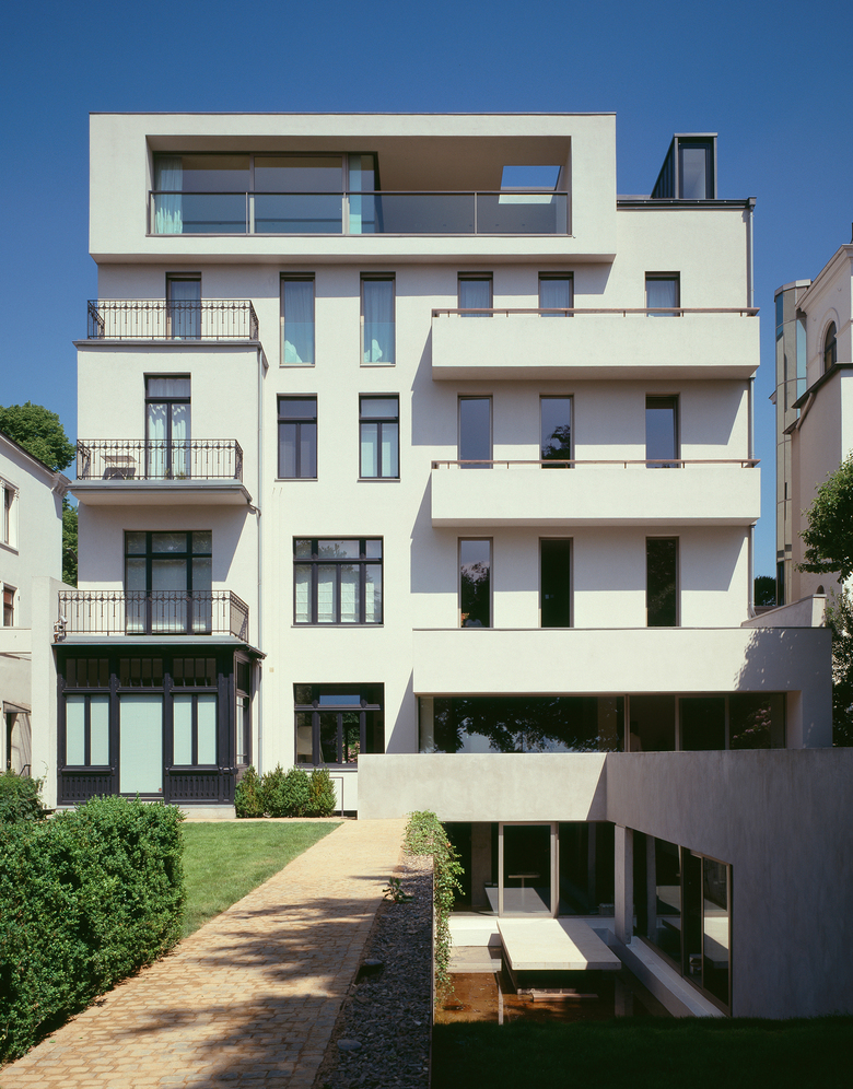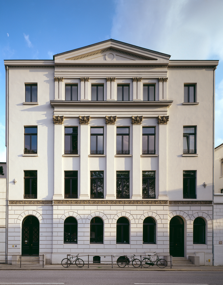 Das viergeschossige Doppelhaus wurde 1855 als eines der letzten Gebäude einer Reihe spätklassizistischer Wohnhäuser errichtet und ist Teil des denkmalwerten Ensembles in der Klopstockstraße. Nach verschiedenen Zwischennutzungen und umfangreichen, in Abstimmung mit dem Denkmalschutzamt durchgeführten Sanierungs- und Umbaumaßnahmen beherbergt das Gebäude ein Architekturbüro und mehrere Wohnungen unterschiedlicher Größe. Das 3. Obergeschoss und der Dachboden werden dabei über beide Haushälften zu einem Maisonette-Penthouse zusammengefasst. Während die straßenseitige Fassade denkmalgerecht saniert wird, zeigt sich die zur Elbe ausgerichtete Gartenfassade als eine Collage aus historischen und zeitgemäßen Architekturelementen, an denen sich die unterschiedlichen Nutzungen und Zeitschichten ablesen lassen.