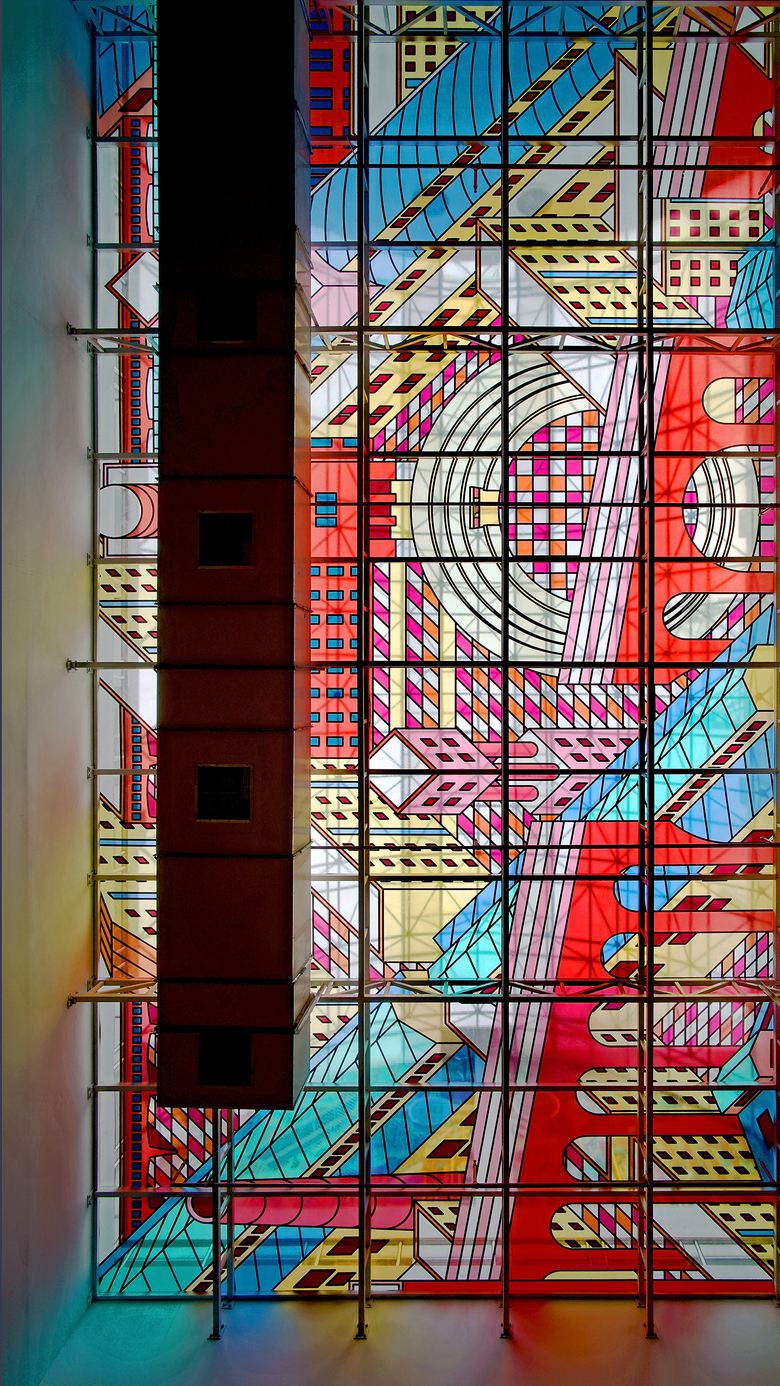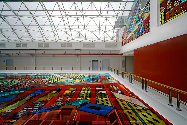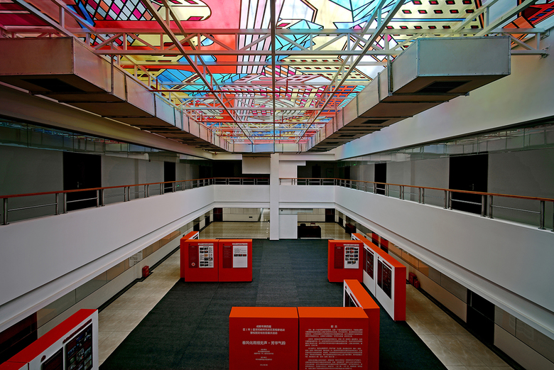 The largest surface inside the public space of the Party School is the glass roof of the atrium. With this largest surface, DAS uses the image to cover the glass roof, turning the regular glass into some “stained glass” with printed glass film.