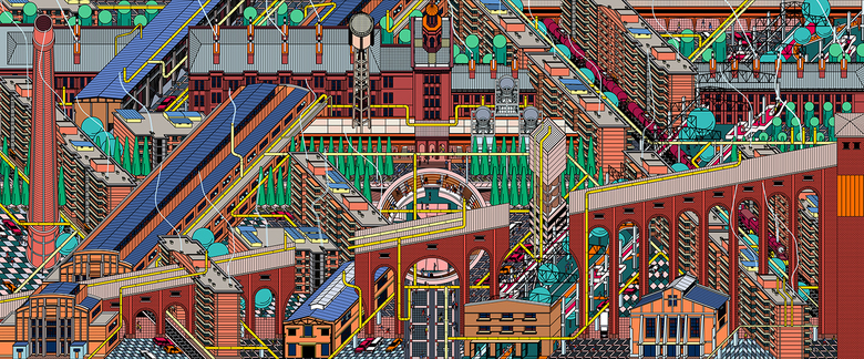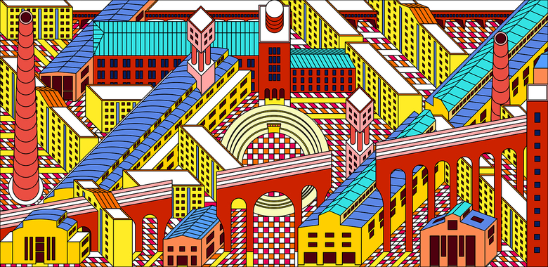 The second drawing Factory Structures depicts those iconic factory structures like chimney, water tower, covered bridge, and etc. which are some most impressive memories about factory.