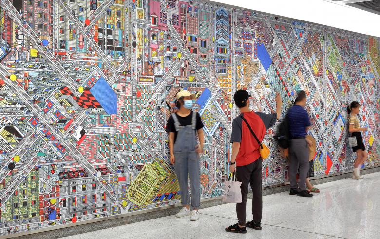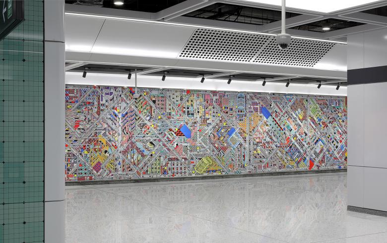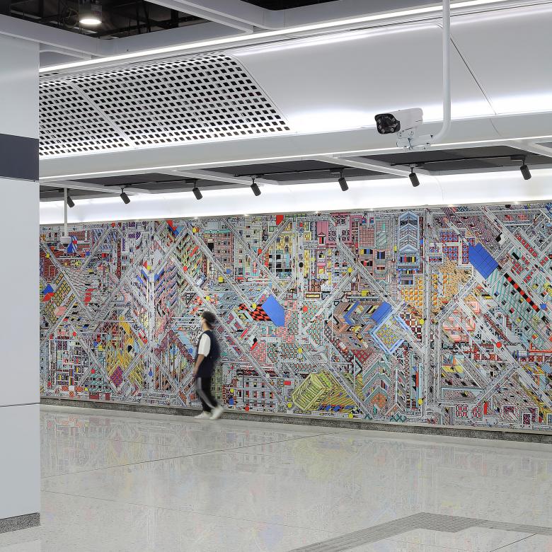 Living Together is a terracotta mural DAS created for the Gan Keng Station of Line 10 of Shenzhen Metro. Taking the urban village of Shenzhen as the theme again, DAS focused in this piece on the rich tiling texture of the facades of buildings in the urban villages and explored another drawing technique: hatch. Drawing inspiration from Pointillism art, DAS divided large color blocks into “color dots” but each dots maintains its “clear line” outline and its own coloring is still flat. Being seen closely, the image looks as numerous abstract tiny swatches. Each swatch has a clear border but it is hard to tell the overall image. Being seen from a distance, the image of the urban village finally appears as the lines between the swatches become weakened and countless high saturated color dots create a series of “bright” greyish color tones.