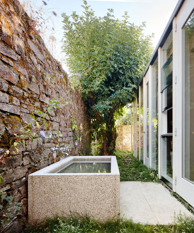 At the rear, a newly built pavilion houses a special apartment with its own private garden and outdoor granite tub alongside an old stone wall. It is a cross-laminated timber structure of Galician pine that was assembled in a day. Its glass facade incorporates custom-made frameless double-hung windows between white wooden uprights.