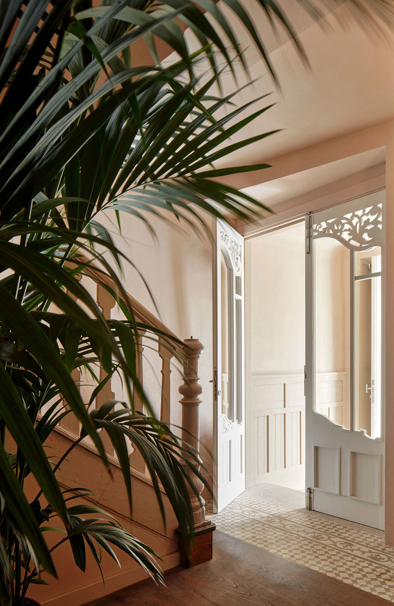 The intervention has been extremely respectful towards the listed features of the building, as well as towards other features that were not listed but which have been considered to be equal or greater in value. The listed stairs have been restored and new ones constructed using the same technique and the same language. The upper gallery which gives onto the street and the gallery on the rear facade have both been reconstructed with cedar-wood window frames with the same form as the originals.