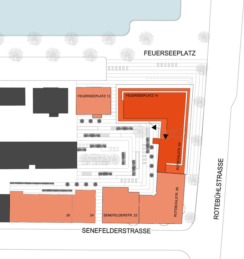 Das in Privatbesitz befindliche Areal umfasst insgesamt 7 Gebäude entlang des Feuerseeplatzes, der Rotebühl- und Senefelderstraße im Stuttgarter Westen. Drei der Gebäude stammen aus der Gründerzeit und sind denkmalgeschützt. Ein weiteres, durch einen Bombenschaden schwer beschädigtes historisches Gebäude (Rotebühlstraße 64), wurde in der Nachkriegszeit lediglich provisorisch wiederaufgebaut und über Jahrzehnte mit einem Notdach bedeckt. Die anderen Häuser entstanden in den 50er und 60er Jahren des 20. Jahrhunderts.