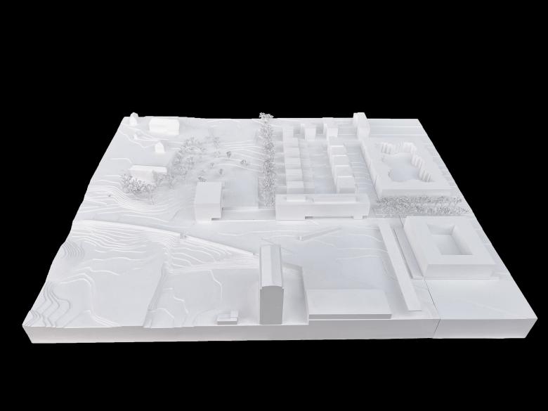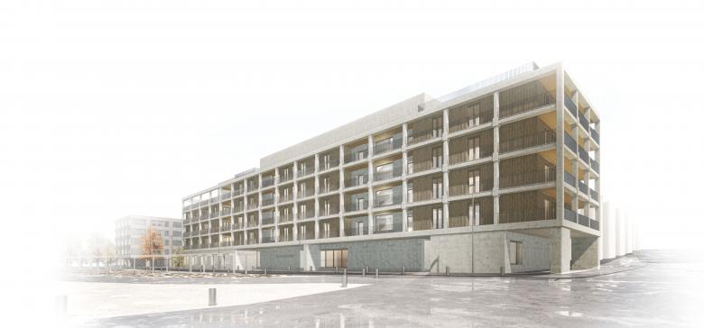 Eine Hybride Baukonstruktion reagiert im äusseren Ausdruck auf die ortstypische Massivbauweise aus vorfabrizierten Betonkonstruktionen und wird dem nachhaltigen Bauen gerecht. Das massive Erdgeschoss und die Treppenkerne werden durch eine Holzbaukonstruktion ergänzt. Eine tragende Betonfassade nimmt Aussenräume auf und schafft Tiefe für den sommerlichen Hitze- und den konstruktiven Witterungsschutz.