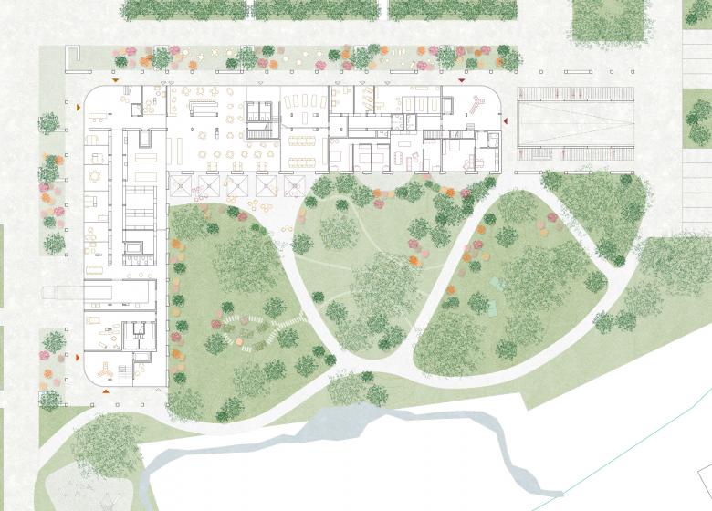 die Ecken des Gebäudes mit grosszügigen Eingangshallen. Die Aussenräume entsprechen dem Konzept des Gestaltungsplanes: Gegenüber dem Wegekreuz werden intensiver gestaltete «Vorgärten» ausgebildet. Zum Schluchtbach entsteht dank dem Verzicht auf den nördlichen Gebäudeflügel eine grosszügige öffentlich zugängliche Parklandschaft.