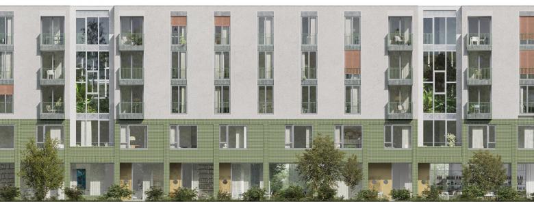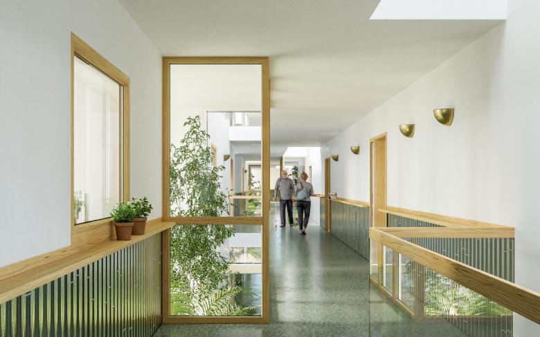 Mit dem Neubau wird das öffentliche Wegkreuz des bestehenden Gestaltungsplanes gefasst und aufgewertet. Über die Arkade erhält das gesamte Gebäude eine starke Gesamtadresse. Die drei Hauptnutzungen – Pflegestation, betreute Wohnungen, Wohnungen mit Service - betonen