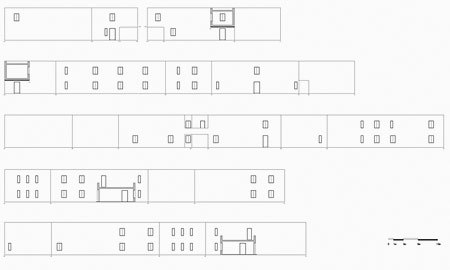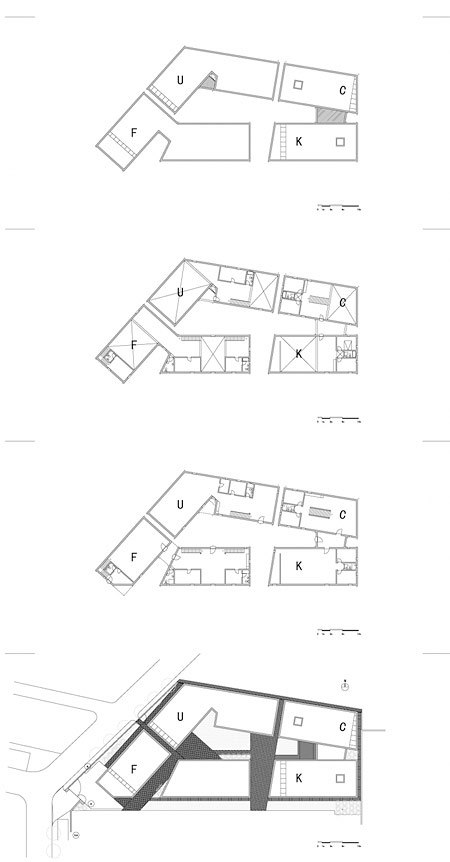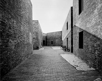 Courtyard 104 is adjacent to the north side of courtyard 105. Within the site of 1755 sqm, three sets of two-story studio-houses form a public courtyard while retaining individual outdoor spaces. The total building area is around 1564 sqm. The exterior walls consist 70% gray-colored bricks and 30% red bricks. With simple treatment, most of the construction material is exposed inside the house.