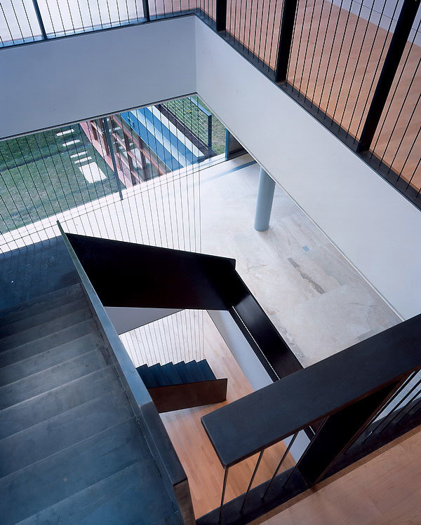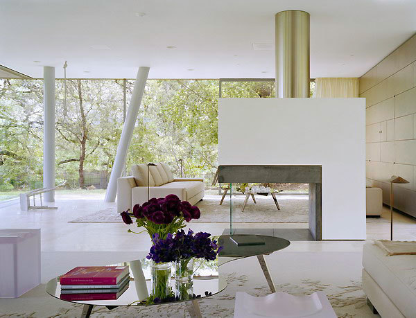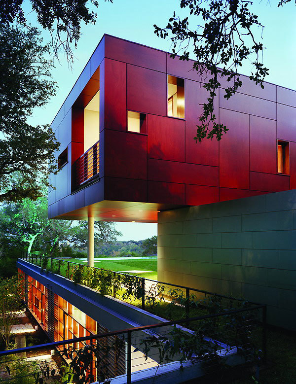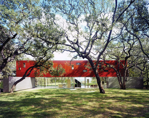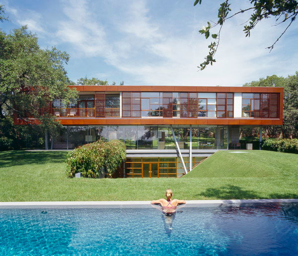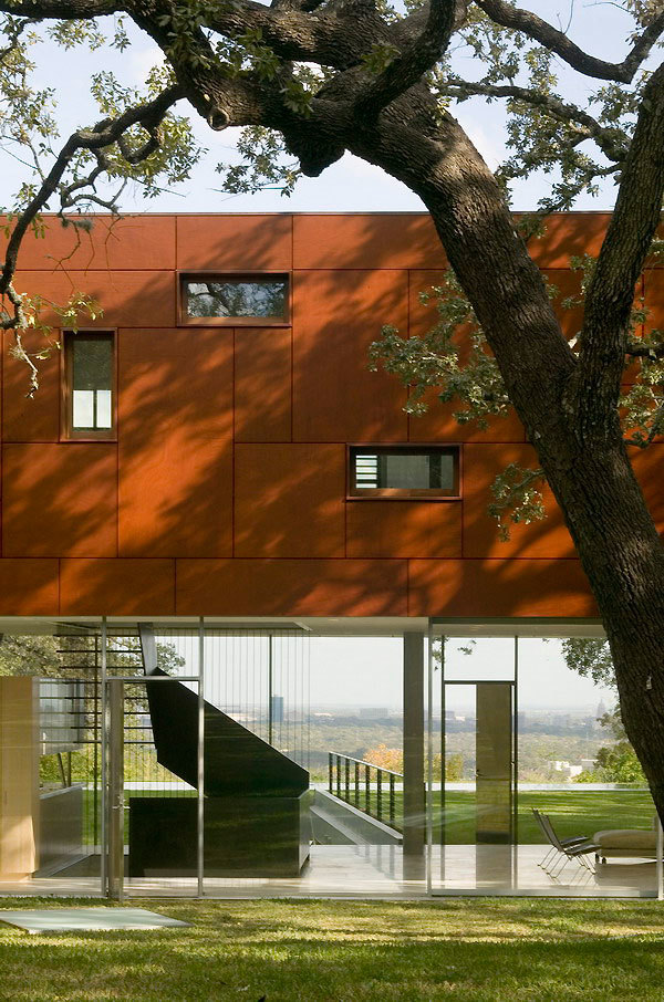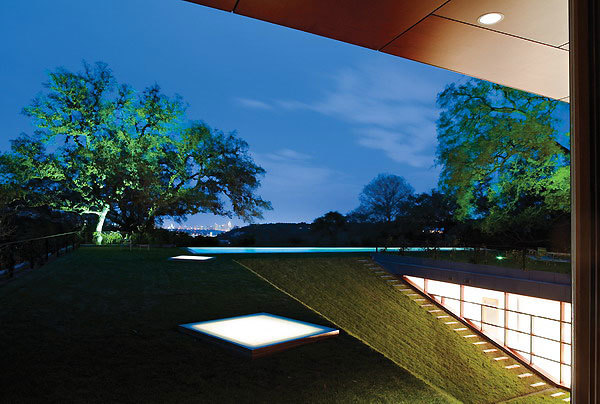 Standing amid a grove of two hundred landmarked live oaks, significant portions of this house were built below grade to maintain the rural landscape of the site. Between the ground plane and the floating box is an entirely transparent glassed enclosure that gives the living room, dining room, and kitchen unobstructed views of the natural surroundings on one side and the Austin skyline on the other. The stainless steel structure holds all the mechanicals for the house and produces the illusion of a wall-less space and a floating box above.