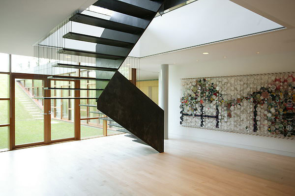 Moving through the building, the sectional complexities add to the spatial experiences inside and outside the house. The sunken courtyard, formed by a sharp cut in the earth, connects the ground floor to the transparent living room by an upward-sloping grass ramp. This ramp becomes the roof of the buried sections, with skylights cutting through the grass to provide natural light for the spaces below.