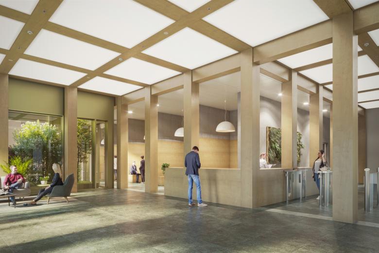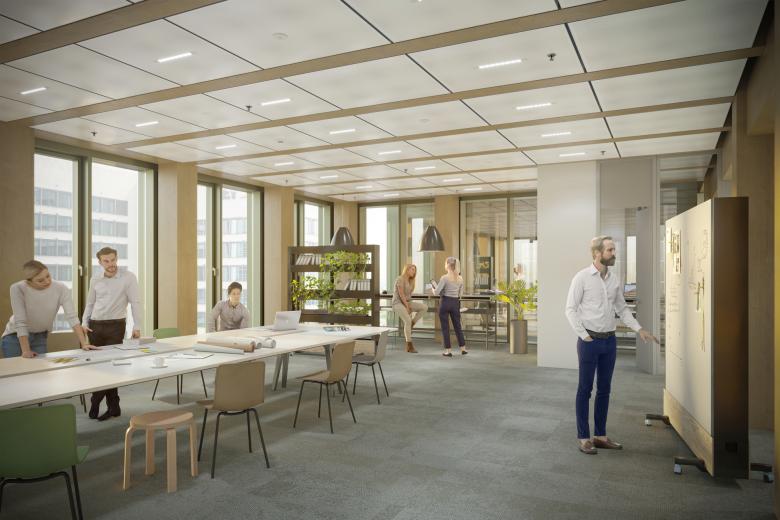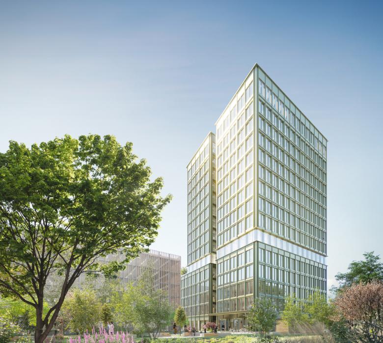 Mit ›The Change‹ entsteht das erste Holz-Hybrid-Bürohochhaus in Eschborn. In dem 60 Meter hohen Office-Tower entstehen auf 15 Geschossen rund 13.500 Quadratmeter flexibel teilbare Mietflächen mit besonderer Aufenthaltsqualität. Bei der Holz-Hybrid-Konstruktion werden die Baustoffe Holz und Beton ideal miteinander kombiniert. Beton kommt in den Untergeschossen, dem Erschließungskern und bei den aussteifenden Bauteilen zum Einsatz. Holz wird ebenfalls als konstruktiver Werkstoff eingesetzt, der anteilig Beton ersetzt und so den CO₂-Footprint des Hauses erheblich reduziert. Es wirkt aber auch auf die Innenräume positiv und erzeugt eine angenehme und behagliche Arbeitsatmosphäre. Daher bleibt beim >The Change< die Holzkonstruktion in den Innenräumen unverkleidet und präsentiert nachhaltig den Anspruch des Projekts und der zukünftigen Nutzer.