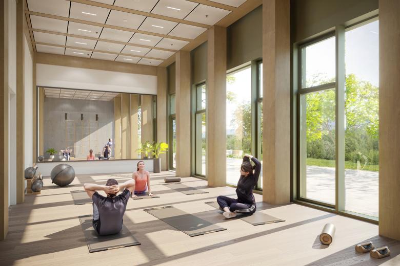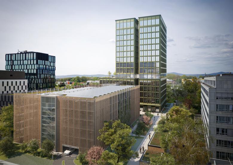 Die Energieversorgung erfolgt überwiegend durch Geothermie und Photovoltaik – nur Spitzenlasten werden über Gas abgedeckt. Ladestationen für E-KFZ und E-Bikes, Sport- und Umkleideräume, sowie die gute Anbindung an das Verkehrsnetz zählen zu den weiteren Stärken. Der Baumbestand auf dem Grundstück bleibt erhalten und wird um eine vielfältige Bepflanzung ergänzt. Zusätzlich werden die Dachflächen begrünt, was insgesamt zur Verbesserung des Mikroklimas und der Biodiversität beiträgt. Über ein smartes Wassermanagement werden die Grünflächen über Retentionsdächer, eine Zisterne und Regenwassernutzung bewirtschaftet.