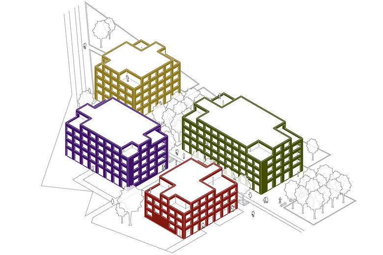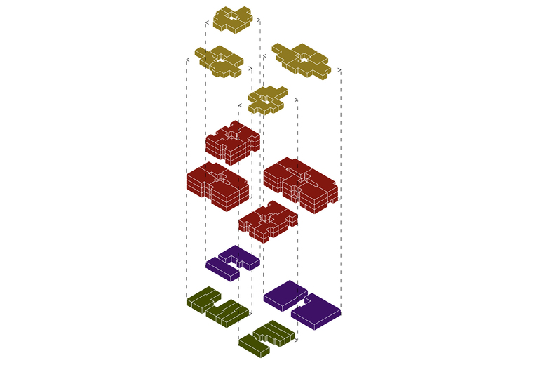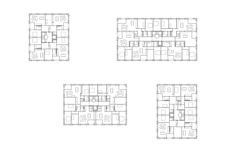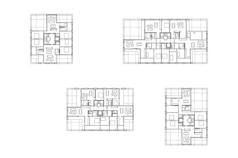 Above these are three levels of dwelling units of average standard, each with a recessed loggia. The cross-shaped penthouse apartments atop each of the apartment buildings form private roof terraces. The resulting subtracted building corners of the penthouse levels give a distinctive appearance to the four buildings proposed by HHF.