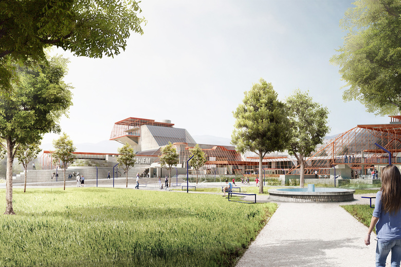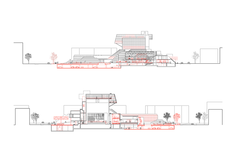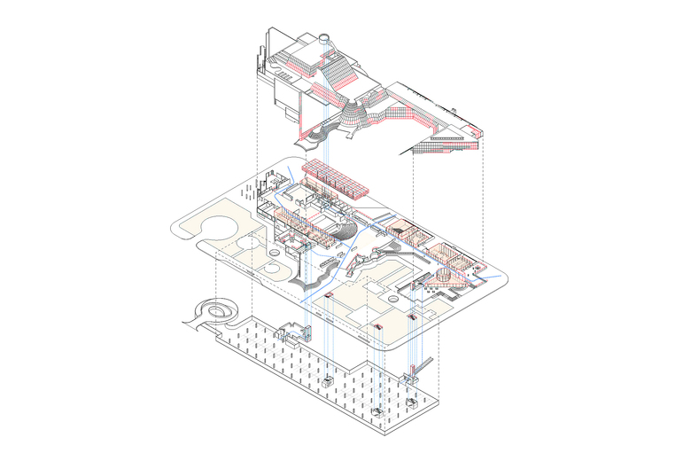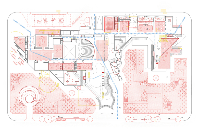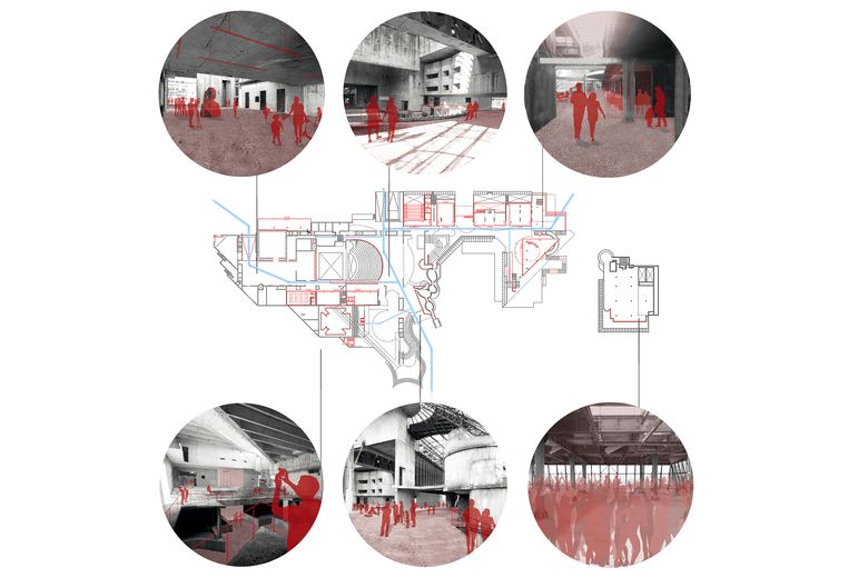 The existing structure is from the Slovenian architect Marko Mušič which was originally planned to represent the socio-political structure of Nikšić, Montenegro and Yugoslavia itself. Functionally it would have contained a memorial to the fallen soldiers, a theatre, a music school and various social functions. The proposal takes the existing architecture as a starting point and with pragmatic interventions, the new infrastructure reinvents the urban space. A strategy of 10/20/70 was developed where 10% would be programmed, 20% would be renovated and 70% would be made safe and secured. Essentially the existing structure was treated as a covered landscape and the ground floor plan was intersected by two main promenades which would lead people through the space, serving as a path for discovery and connecting the infrastructure to the city of Nikšić. The approach applied to Dom Revolucije is an architecture of reuseism.