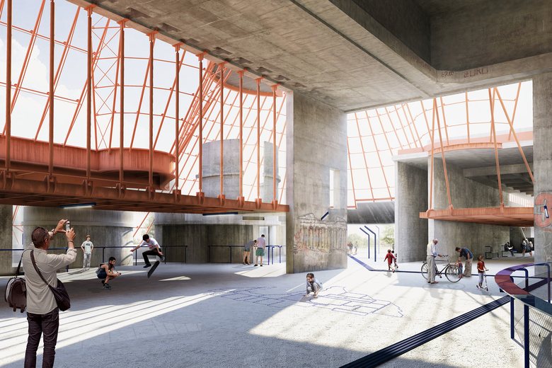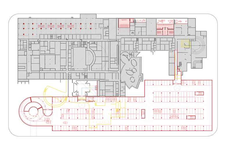 By treating the existing structure as an urbanscape rather than a building, HHF and SADAR+VUGA developed a 10/20/70 strategy. The 10% refers to spaces that would be acclimatized and have year-round defined functions. This is manifested in the form of three plugins which could be inserted inside the existing covered urbanscape. These inserted objects contain a cafe, coworking office and gallery spaces, and educational workshops. The language for these plugins is pragmatic and their volumetrics respond to the adjacent architectural forms. The 20% refers to the promenade which transects the building north to south and east to west. The promenades connect the exterior landscape (Dom Park), the interior plugins, and the access to the underground parking infrastructure. The adjacent spaces along the promenade would be renovated and made safe, but the functions are left undefined and flexible, changing according to the seasons and the users themselves. The 70% are those spaces which are safe and secured, but not renovated. These spaces would not be used on a daily basis, but could be made available for use on special occasions.