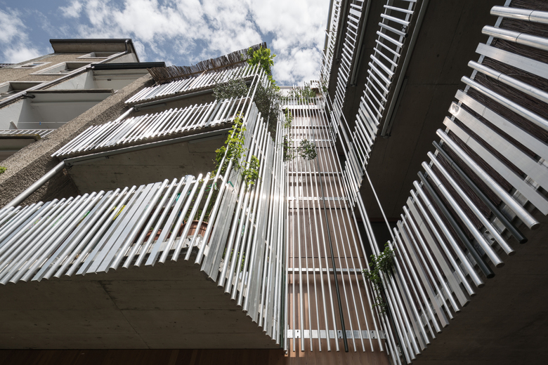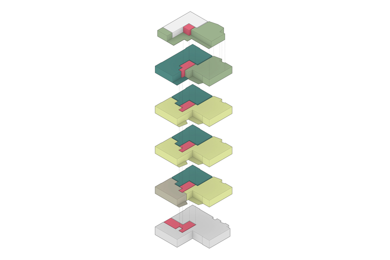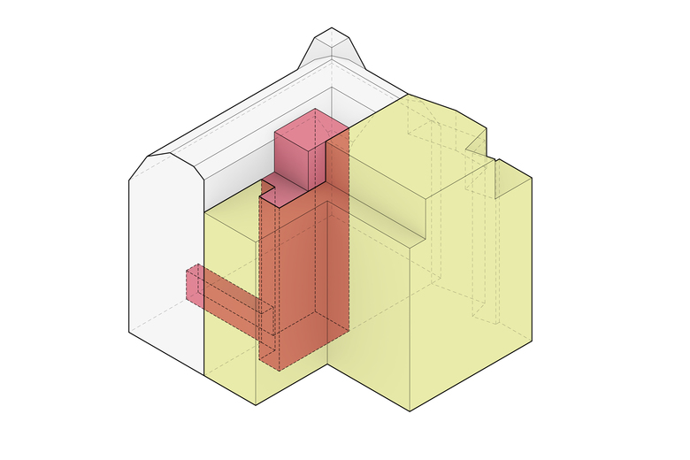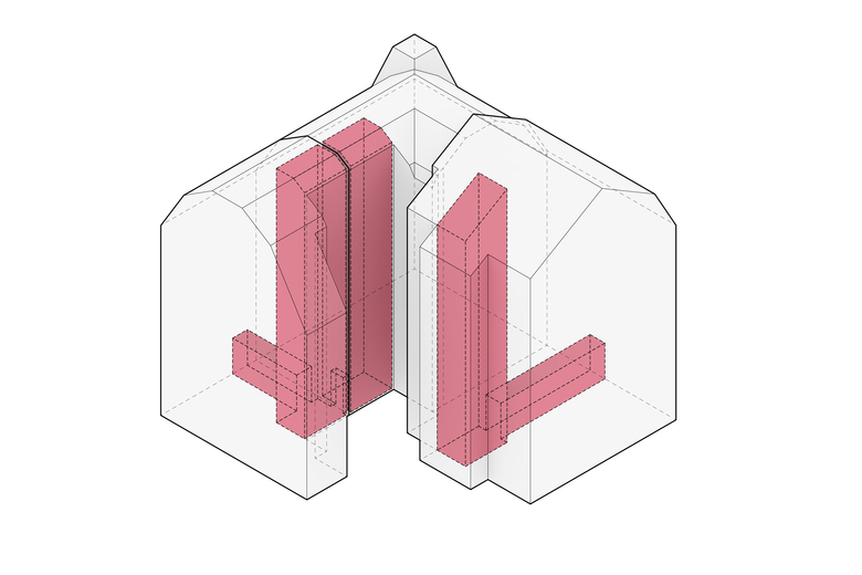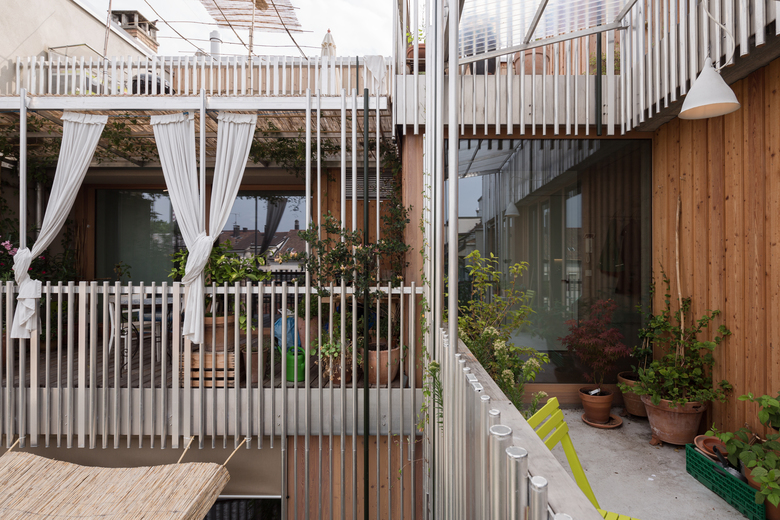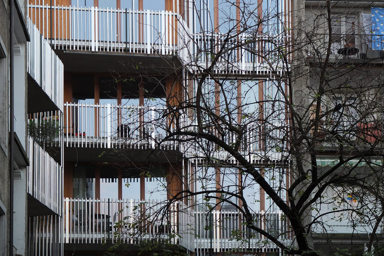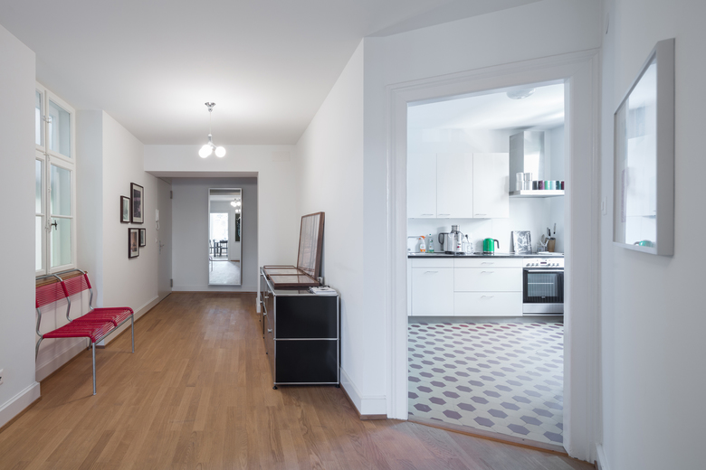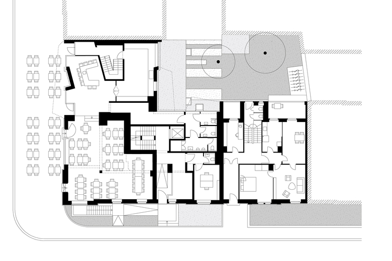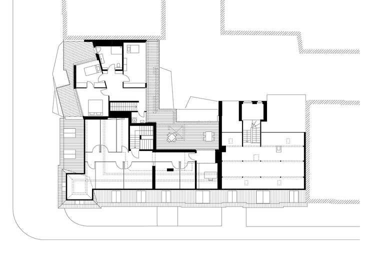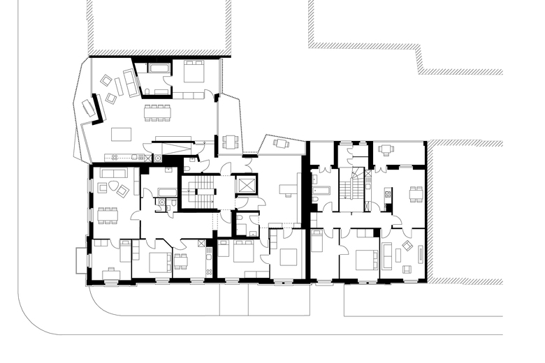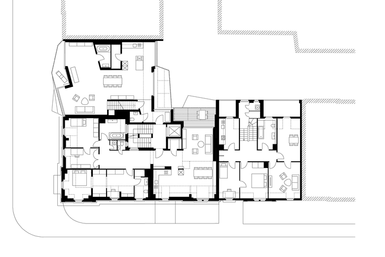 A new staircase and an elevator have been introduced in the courtyard to create a direct access to the old houses and the old staircases were demolished in order to gain floor area. The new measures raise the desirability of the old houses and the ability to keep and lease the existing houses in the future. In the interior the new building is connected to one of the existing ones to allow spacious apartments orientated to all four sides.