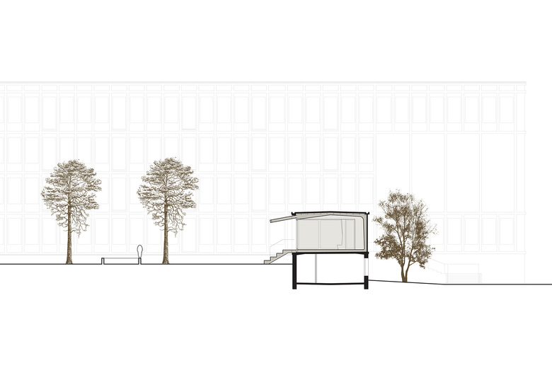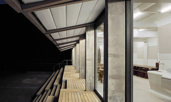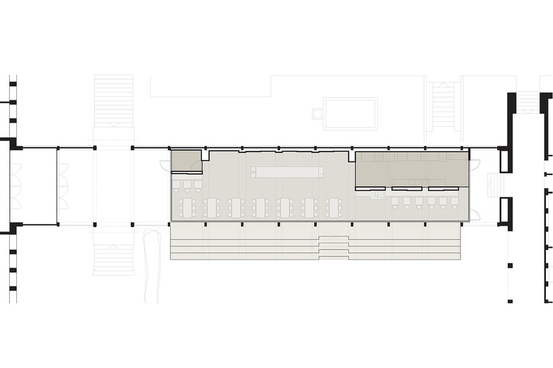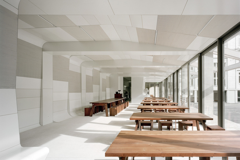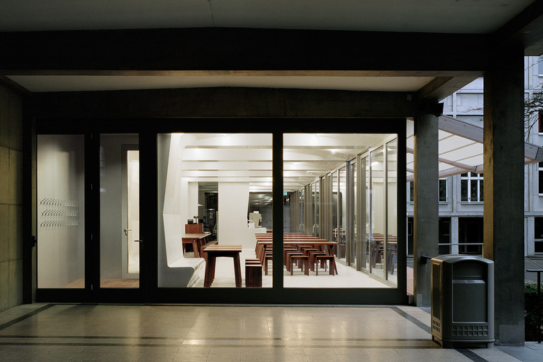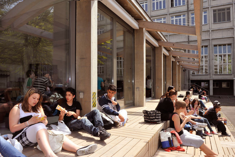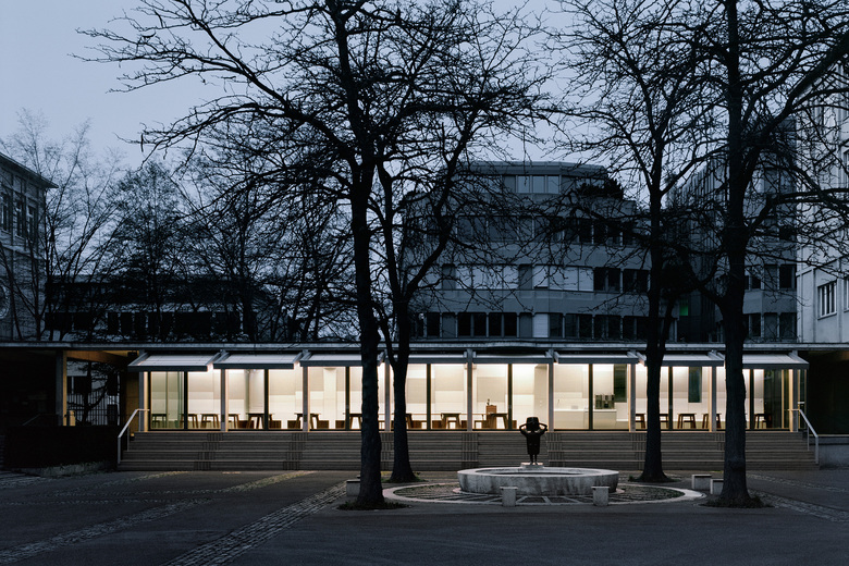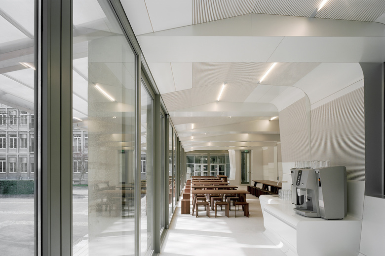 The Kirschgarten project integrates a cafeteria into the existing open lobby of an important school building located in the city center of Basel. Ribbons made of wood are offset from the existing floor, wall and ceiling. These ribbons reach out between the concrete structure toward the courtyard, creating a solar screen and a terrace where people can sit and eat. This gesture links the interior space to the outside and enables direct access from that courtyard.