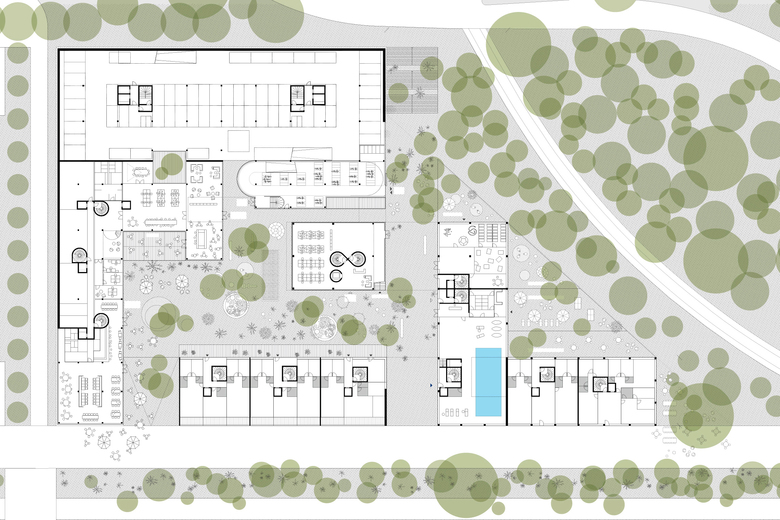 Urban block, mixed-use program with residential, offices, restaurants, indoor swimming pool and daycare