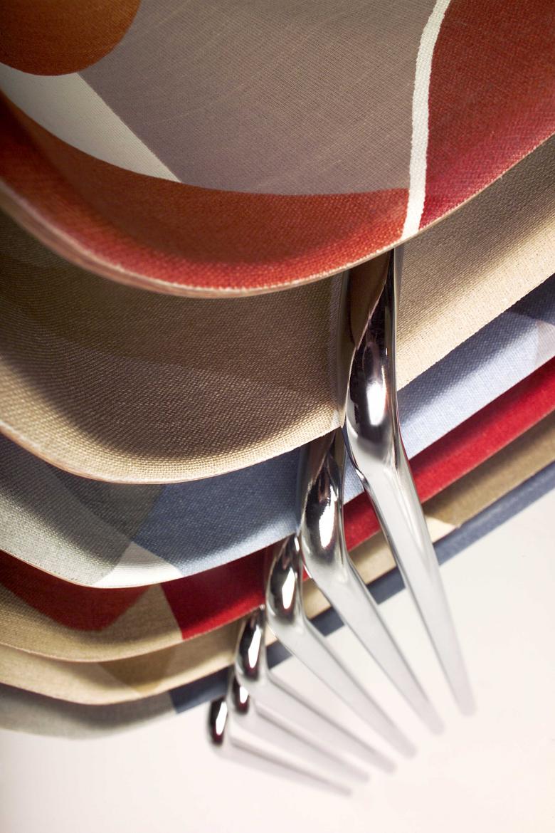 The seat shell is made with a special German press-molding technique and press-molded with Swedish fabric. Then, it is assembled in Italy with pipe legs that are designed by a Japanese designers and bent like a single stroke, and is being developed for the global market.