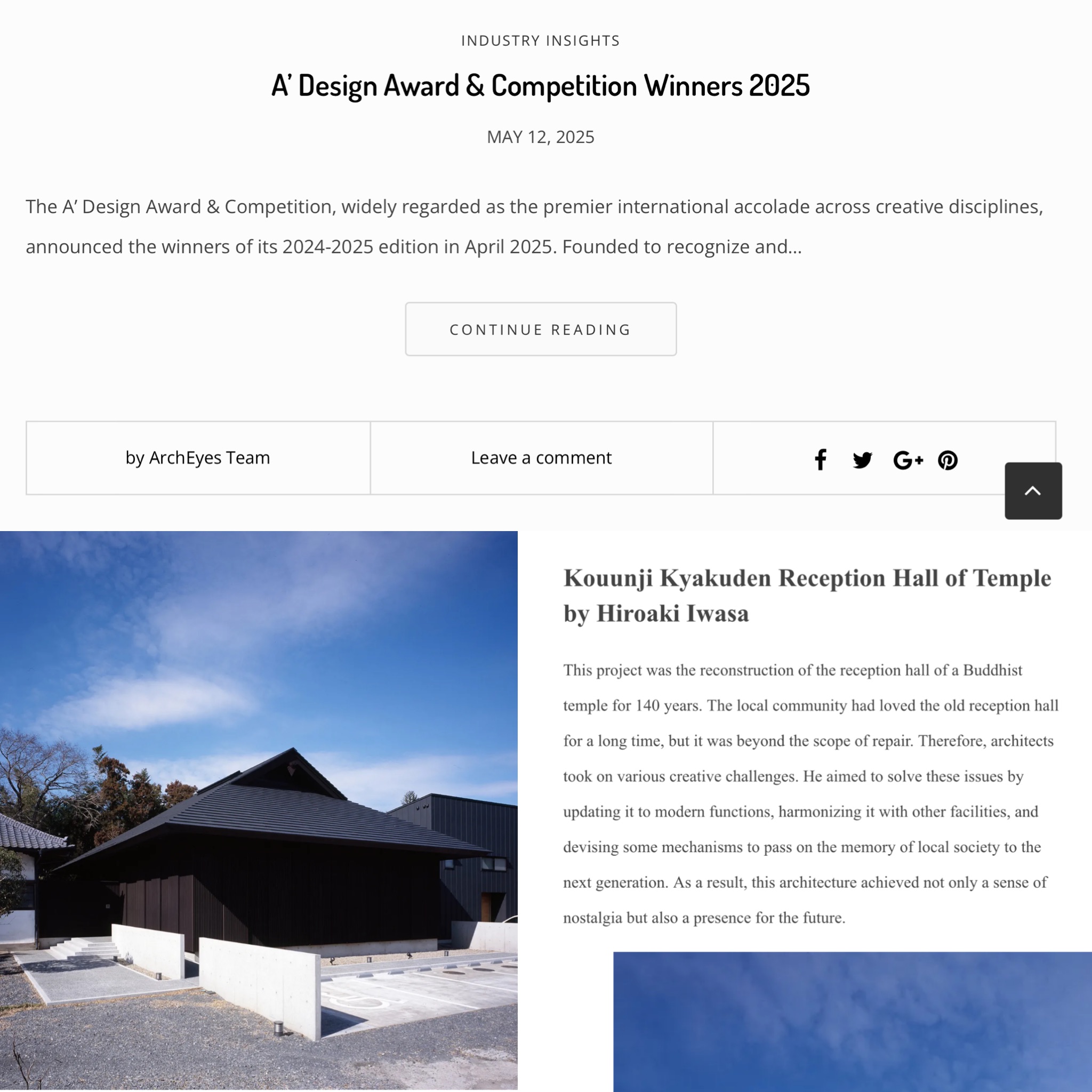 "Kouunji Kyakuden" was featured in the "20 Outstanding Architecture Among the A'Design & Award 2025 Winners" special feature in ArchEyes.com, a web magazine specializing in architectural design that selects timeless works.