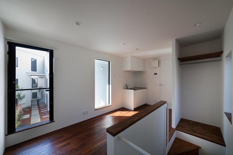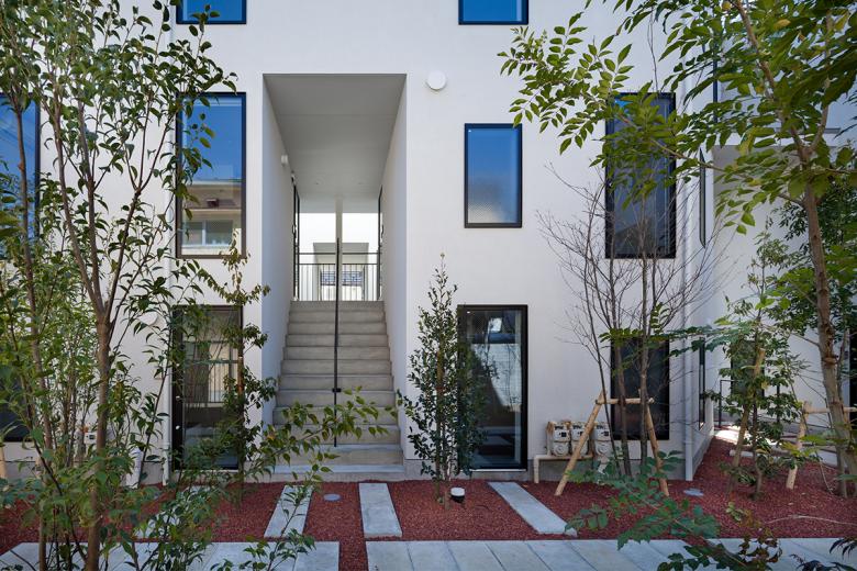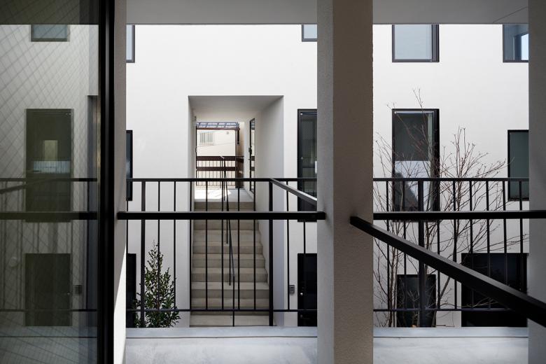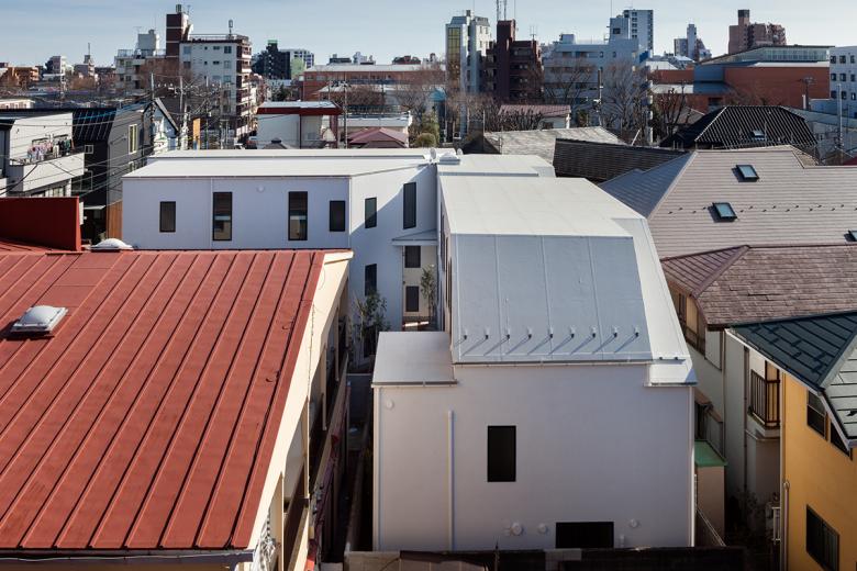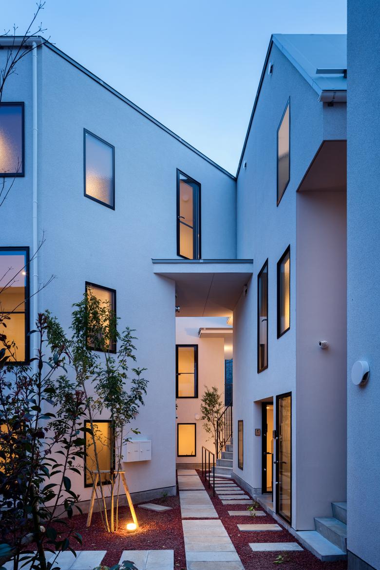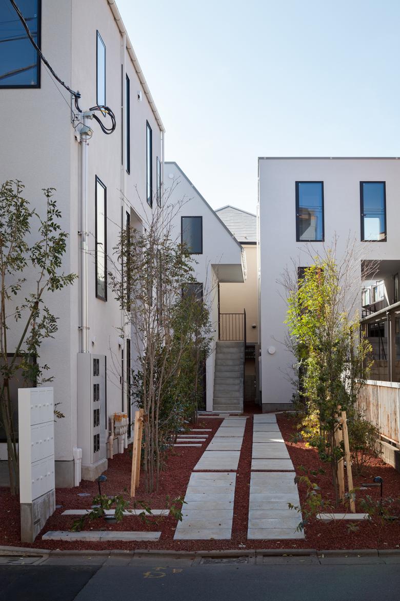 低層の住宅街における木造長屋の計画。建物の高さを抑えていくつかのボリュームに分け、専用階段の一部を外部として抜けを設けるなどして、敷地全体を明るく風通しよくすることを意図した。これが周辺街区に対しても、明るさを提供するだけでなく、道路に開放された公園のような場所として、都市空間として周囲に貢献したいと考えた。