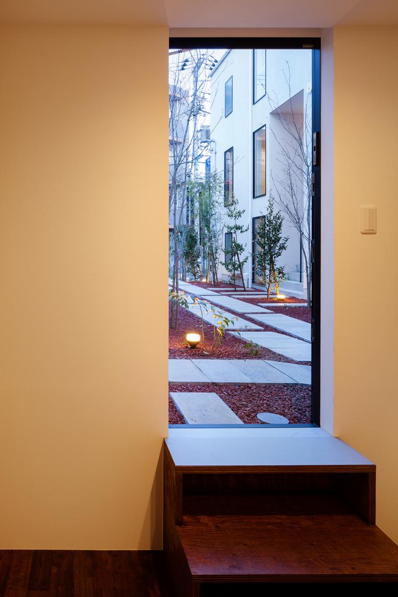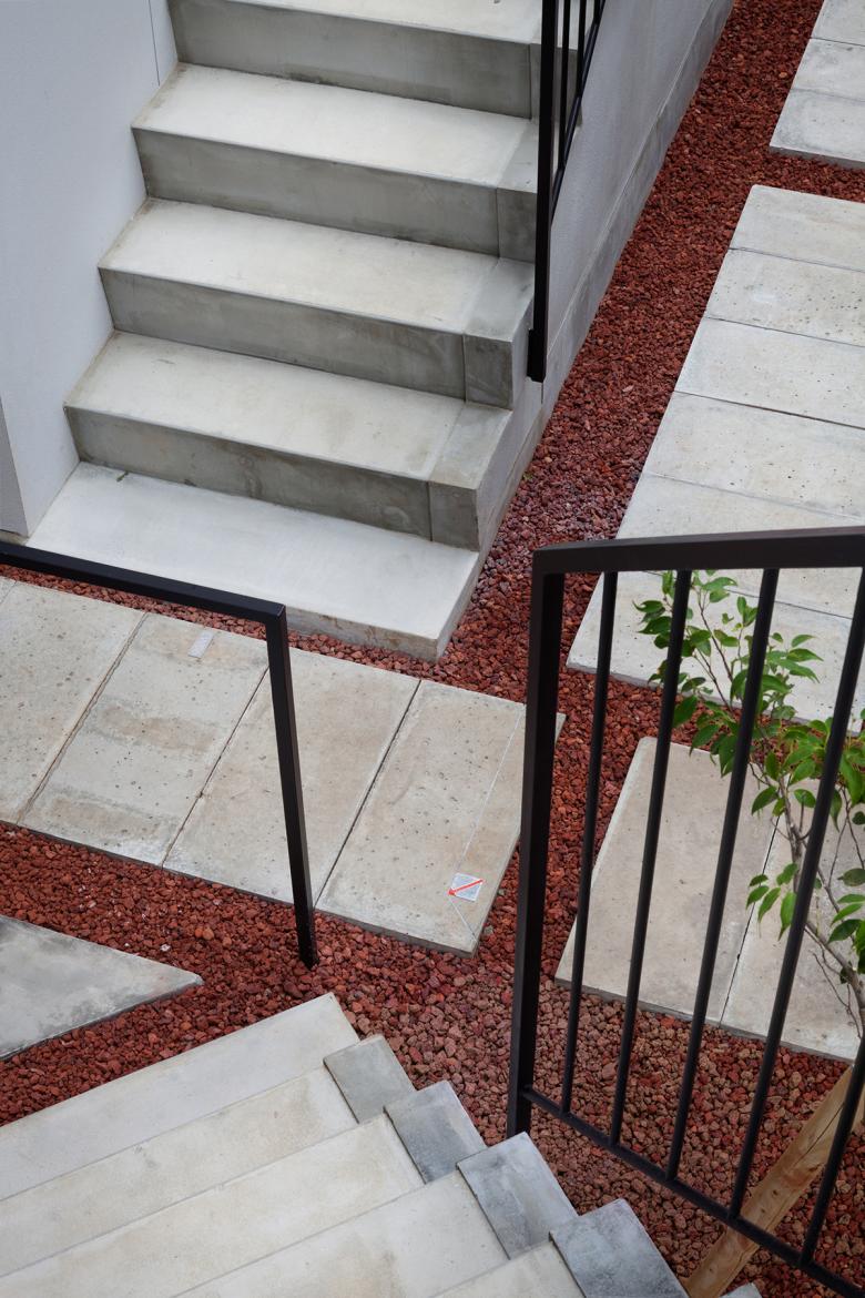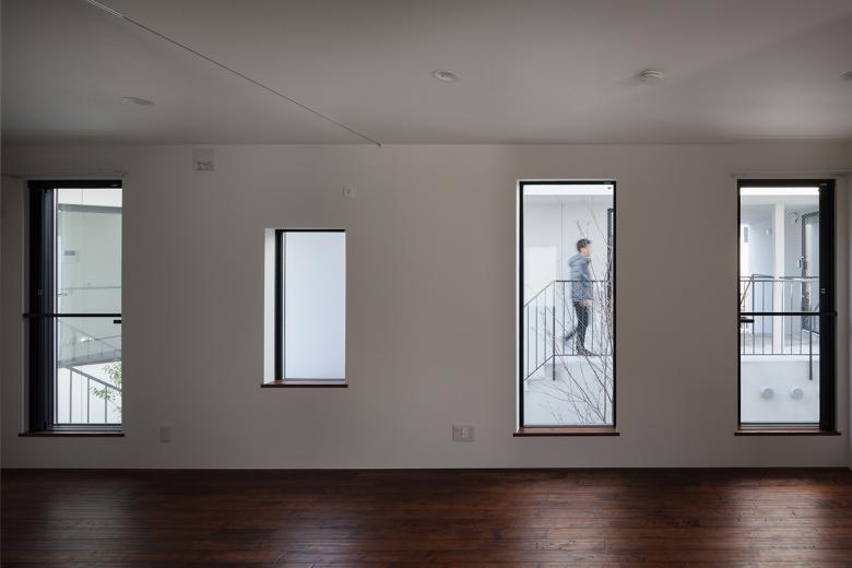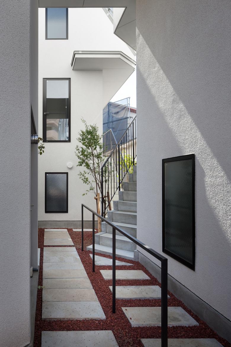 低層の住宅街における木造長屋の計画。建物の高さを抑えていくつかのボリュームに分け、専用階段の一部を外部として抜けを設けるなどして、敷地全体を明るく風通しよくすることを意図した。これが周辺街区に対しても、明るさを提供するだけでなく、道路に開放された公園のような場所として、都市空間として周囲に貢献したいと考えた。