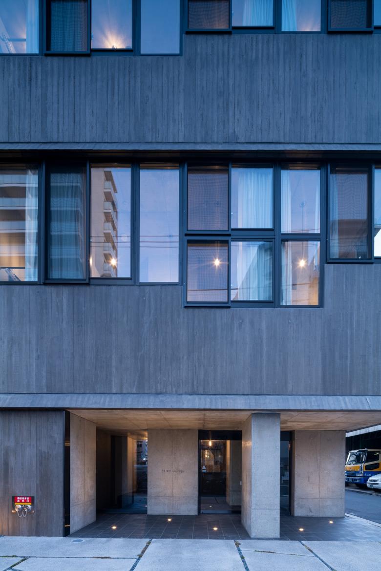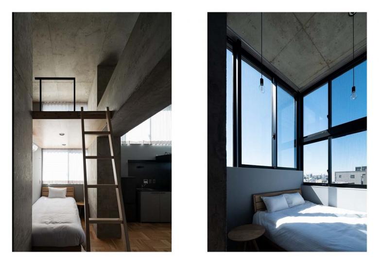 塔状比(縦横比)の高い、いわゆるペンシルビルでは一般に、部屋のスケールに対して構造体が大きくなりすぎるのが問題であるが、むしろ大きな躯体を生かした魅力的な空間にしたいと考えた。 できるだけ多くの居心地よい場所をつくれるよう、横連窓を3方に設けた。腰壁高さを変えることで、家具配置と連動しつつ、内部と周囲の状況を調停し、結果的に別の部屋にも泊まりたくなるようなバリエーションを作れたらと考えた。 各階に庇を設けることで、雨天でも換気がしやすく空調負荷を抑えられるだけでなく、雨水が外壁を伝わないようにすることで外壁の耐久性の向上を図っている。