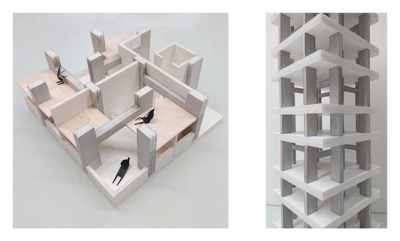 梁の交点に柱を置かない千鳥の柱配置によって、ベッドスペースを緩く仕切りながら流動性の高い空間が実現できた。ロフト床を支える鉄筋コンクリートの貫は、風車状に配置されているが、その向きを上下階で反転することでバランスよく建物全体の剛性を高められている。ロフトレベルでは貫の高さは手摺や腰掛、テーブルとして利用できる。 扁平柱に貫が架かることで高さ方向は分割される一方で、水平方向は柱2本をまたぐ大きなスケールを獲得する。構造体が身体と対応したり、逆にそれを超越したりするさまざまな寸法を持つことで、その周囲や上下に人が寄り添う場を生みつつ、同時に自律的でもあり続ける。ベッドの配置など固有の目的に応えながら、最終的には別の用途にも使い得るし,使いたくなる状況、すなわち人が側に居たくなる躯体を目指した。