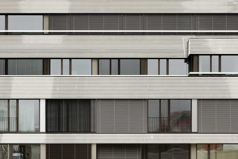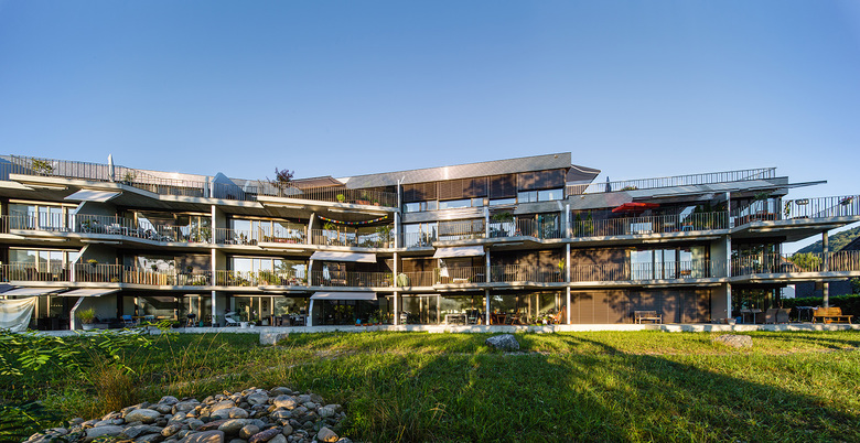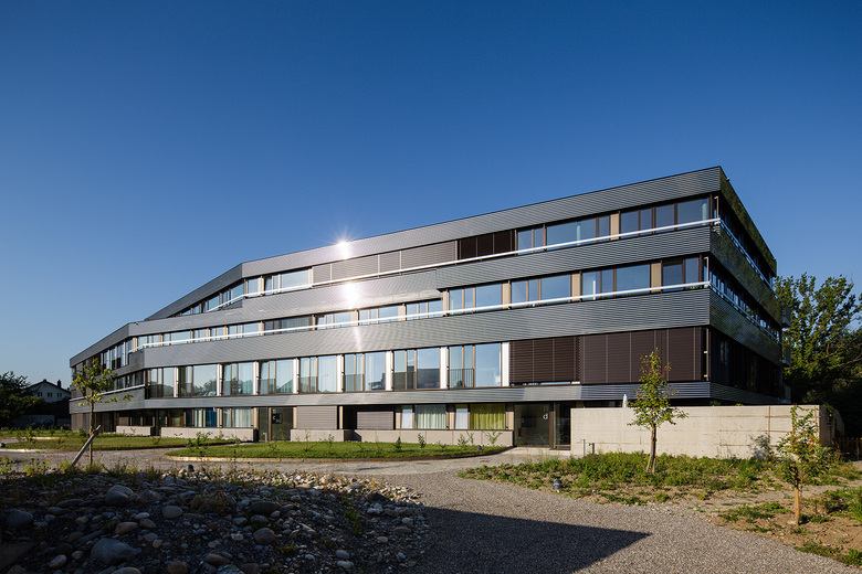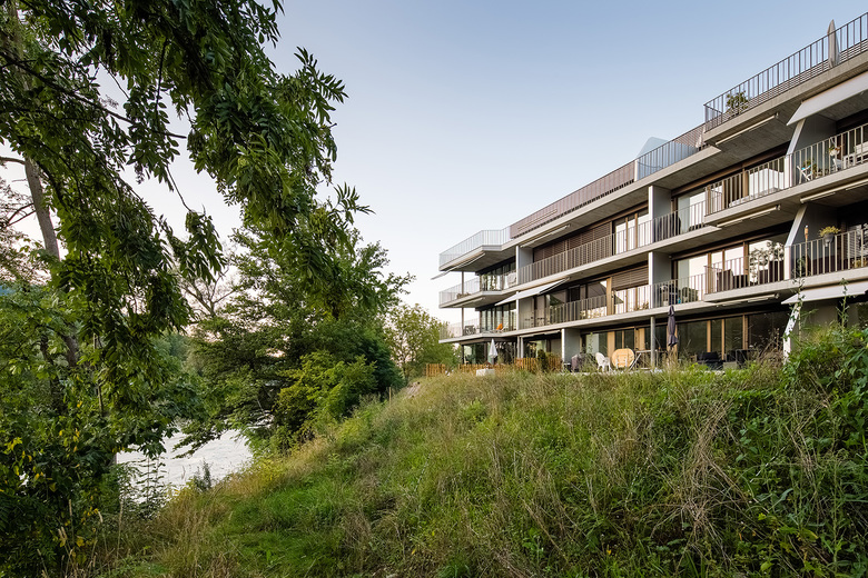 Das gesamte viergeschossige Wohngebäude orientiert sich in Richtung Fluss und Natur. Durch den Knick des Baukörpers wird das Volumen aufgebrochen und sowohl die Aussichten als auch die Beleuchtung optimiert. Jede einzelne der Durchsteckwohnungen verfügt über einen Blick auf den Fluss und erhält von zwei Seiten natürliches Licht. Die Kompaktheit des Baus und seine Platzierung nahe am Ufer lässt eine grosszügige Grünfläche für einen verspielten, naturnahen Garten frei.