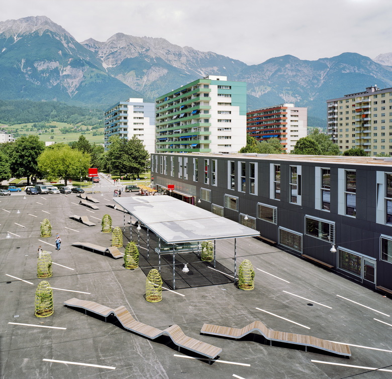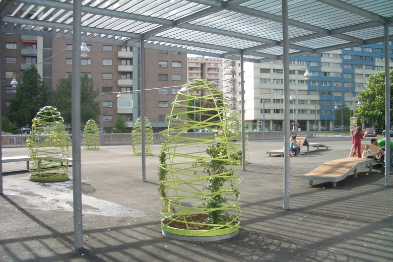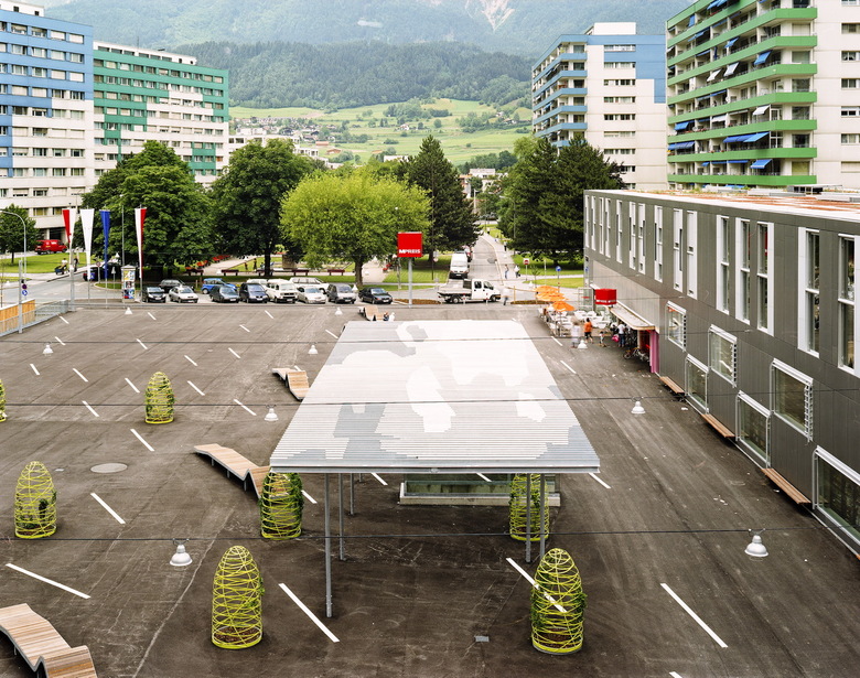 Der öffentliche Platz bildet das neue Zentrum des Quartiers. Gleich einem bespielbaren Teppich wird er zur Pattform des Alltagslebens sowie der gemeinschaftlichen Aktivitäten. Die offene Gestaltung erlaubt die beliebige Durchwegung und Benutzung. Eine formale Konzentration erfolgt im Bereich der wolkenartigen Pergola und dem Alpengarten: Geometrisch angeordnete Rankgerüste in der Form von „Heumandln“ spannen ein Feld auf, welches differenziert räumliche Erlebnisse bietet: Je nach Standpunkt schließen sich die Reihen oder werden durchlässig – ein einfaches, aber wirksames Prinzip, wie wir es vielleicht von Almwiesen der Kindheit kennen. Dieser „Alpengarten“ teilt den als Marktbereich gedachten nördlichen Teil vom südlichen, der den Veranstaltungen der Vereine vorbehalten bleiben soll.