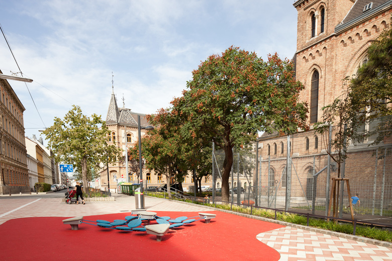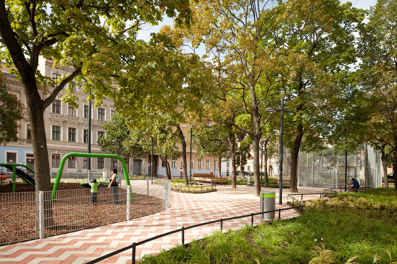 Als Zusammenhalt des Familienplatzes fungiert ein zweifärbiger Belag in Fischgrätmuster. Dieser verleiht dem Ort einen freundlichen Charme. Ein hochwertiges Möbelstück aus Eichenholz zum Sitzen und Loungen wurde speziell für das Projekt entworfen. Die Planung erfolgte unter Beteiligung der AnrainerInnen.