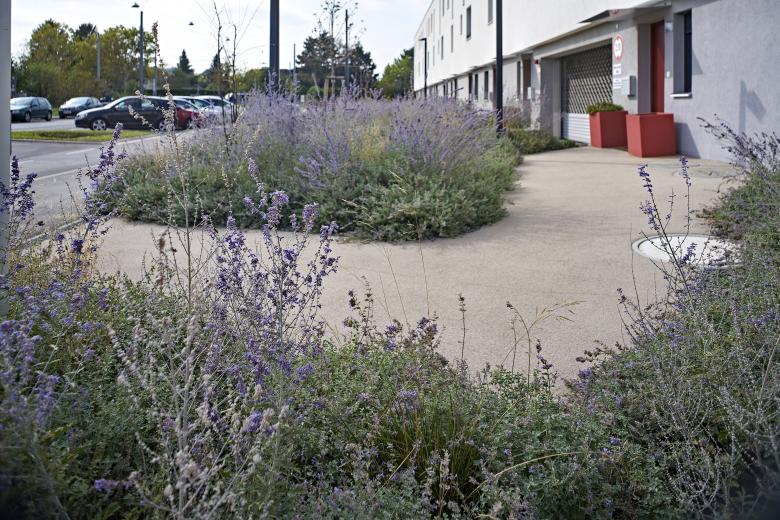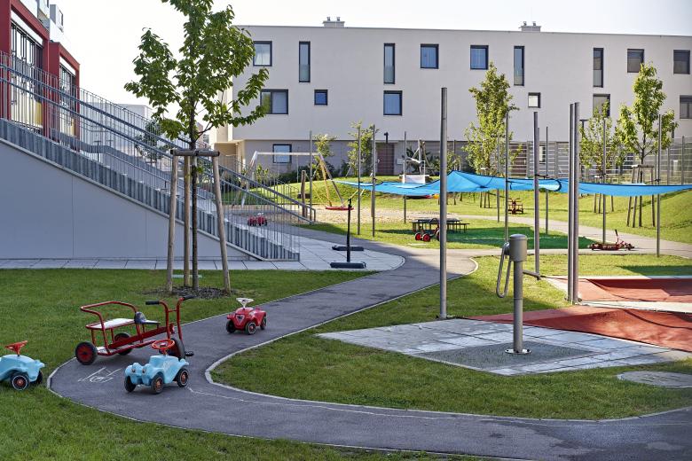 Der große, urban ausgestaltete Eingangsplatz zum Kindertagesheim beherbergt ein Wasserspiel, Sitzmauern, Baumpflanzungen in grünen Inseln sowie großzügig befestigte Flächen für die verschiedenen Platznutzungen. Der urbane Platz dient als Treffpunkt und Drehscheibe des Gebiets nach Außen.