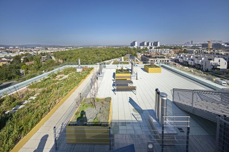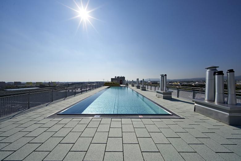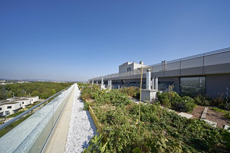 Der Gemeinschaftsdachgarten auf Bauplatz 6, 9 & 10 bietet einen Pool mit Baumpflanzungen, Sonnenterrasse und Liegeelementen. Ein Geschoß darunter gibt es Urban Gardening Zonen mit Mietergärten und Mieterbeeten. Der Urban Farming Bereich ist mit ausreichend Sitzmöglichkeiten und Arbeitstischen ausgestattet. Auf dem Dachgeschoss befindet sich auch eine geschützte Innenhoffläche vor dem Saunabereich.